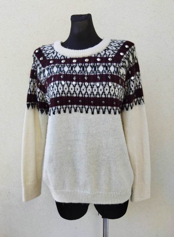 Miły dobrej jakości luźniejszy sweter w kolorze mlecznej bieli z wzorzystą górą przodu w kolorze czerni i brązu z biżuteryjnymi zdobieniami. Wykończony ściągaczami.