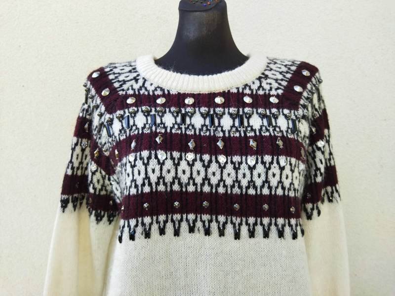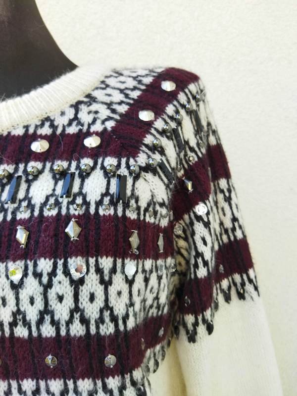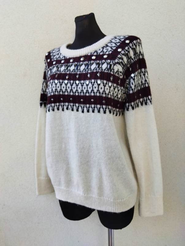 Miły dobrej jakości luźniejszy sweter w kolorze mlecznej bieli z wzorzystą górą przodu w kolorze czerni i brązu z biżuteryjnymi zdobieniami. Wykończony ściągaczami.
