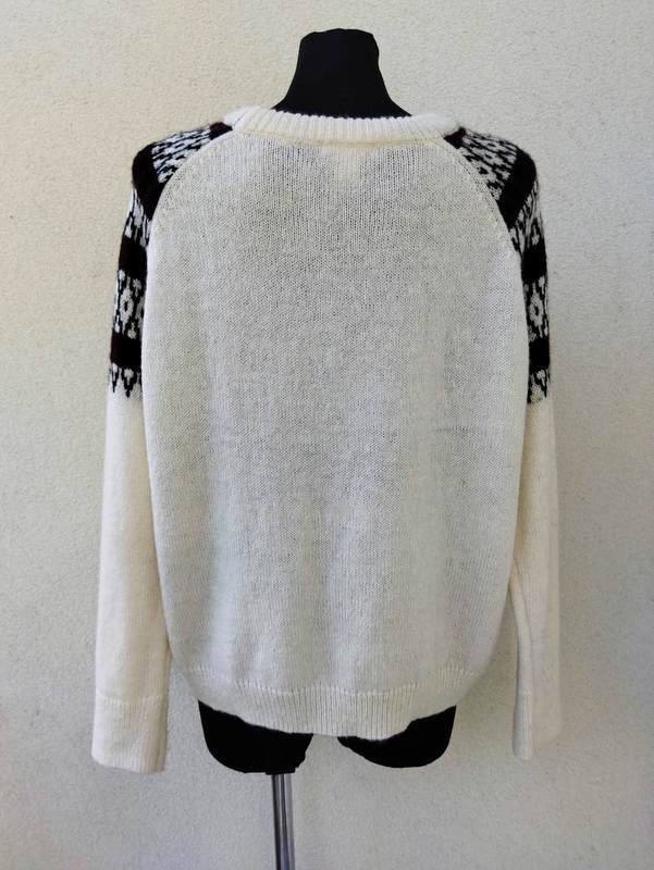 Miły dobrej jakości luźniejszy sweter w kolorze mlecznej bieli z wzorzystą górą przodu w kolorze czerni i brązu z biżuteryjnymi zdobieniami. Wykończony ściągaczami.
