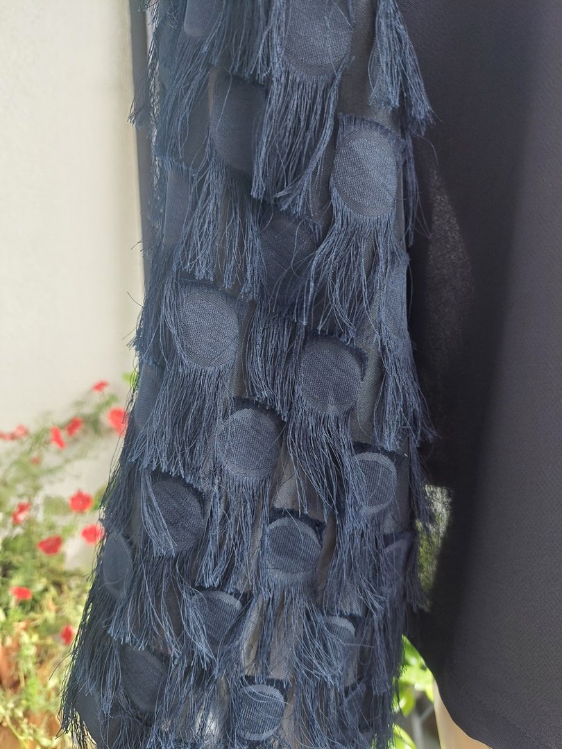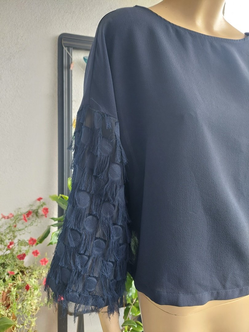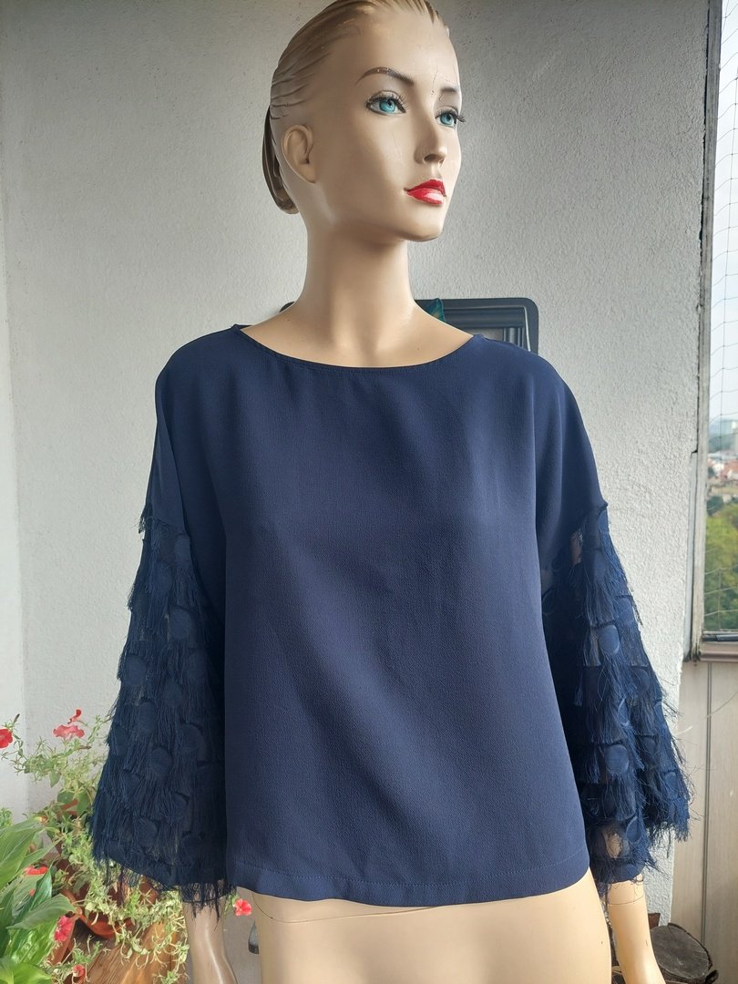 wizytowa bluzka marki H&M. kolor ciemny granat. materiał 100% poliester. rozmiar z metki s, ale to fason oversize. stan bardzo dobry. na manekinie o rozmiarze 38.