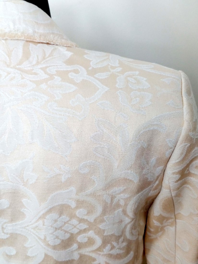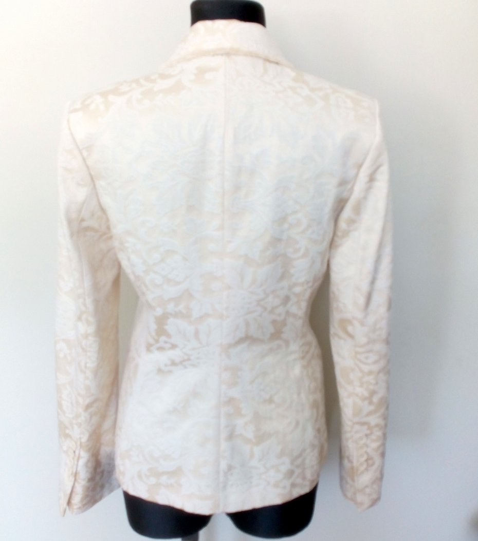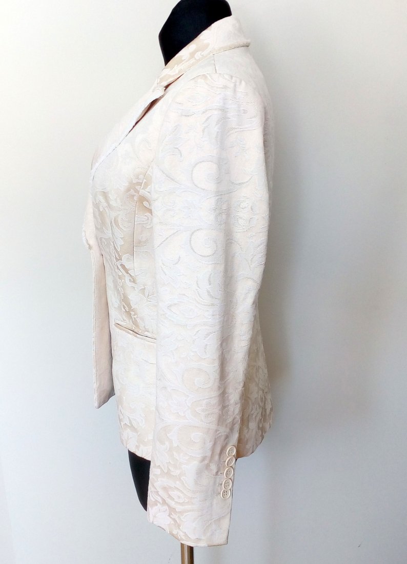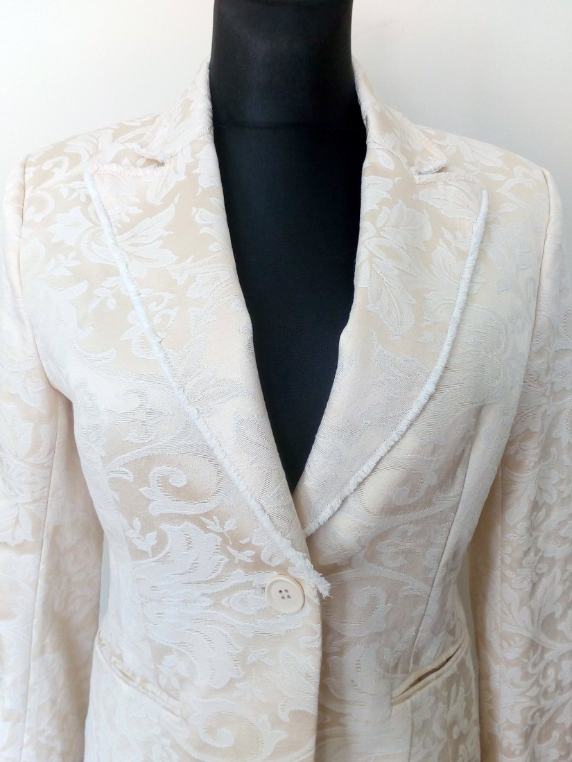 Żakardowy żakiet w jasnym, piaskowym kolorze, tkanina z połyskiem, wytłaczane wzory - matowe, żakiet zapinany na jeden guzik 9zapasowe guziki od środka0, kołnierz z rewersem, brzegi kołnierza z króciutkimi, gęstymi strzępieniami, z przodu wpuszczane kieszenie, rękaw u dołu pęknięty z rzędem pięciu mniejszych guzików, na ramionach poduszki, od środka podszewka w kolorze żakiet w delikatne szare prążki