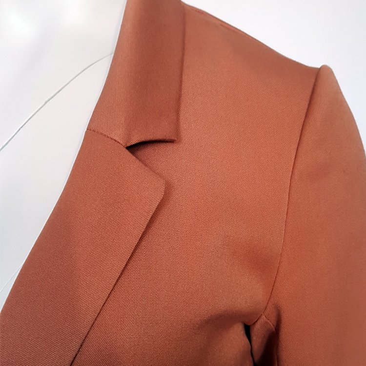 Prosta marynarka z kieszeniami i wąskim kołnierzem, zapinana na guzik. Rękawy długie na podszewce, dobrze wyglądają również w wersji wywiniętej. Podszewką wykończono jedynie rękawy, korpus marynarki jest bez podszewki. Marynarka wykonana z tkaniny średniej grubości, w kolorze rozbielonego rdzawego brązu. Bezpretensjonalny basic na co dzień.