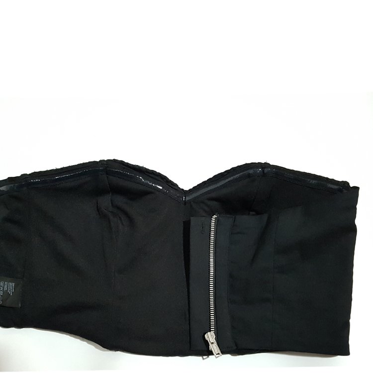 Piękny ozdobny top w kolorze czarnym, zapinany z tyłu na metalowy zamek. Od wewnątrz górny brzeg z tyłu i z przodu wykończony sylikonem zabezpieczającym przed zsuwaniem. Idealny do spodni z wysokim stanem i spódnic. Piękna rzecz.