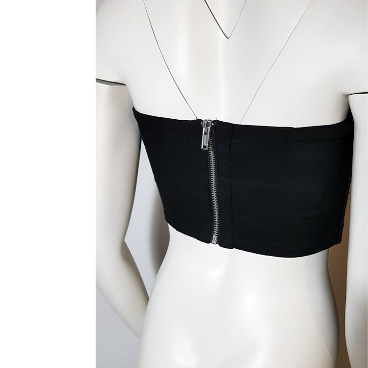 Piękny ozdobny top w kolorze czarnym, zapinany z tyłu na metalowy zamek. Od wewnątrz górny brzeg z tyłu i z przodu wykończony sylikonem zabezpieczającym przed zsuwaniem. Idealny do spodni z wysokim stanem i spódnic. Piękna rzecz.
