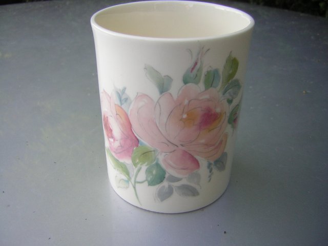 Ekskluzywny, elegancki, Porcelanowy pojemnik łazienkowy. Jakość błyszczącej, ecru prześwitującej porcelany i wysmakowane różane zdobienie w dobrym, angielskim stylu. Klasyczny, prosty kształt. Sygnowany Hadida.Fine Bone China Made in England.
