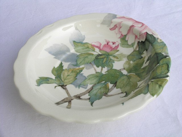 Ekskluzywna, elegancka miso-patera łazienkowa. Jakość błyszczącej, ecru prześwitującej porcelany i wysmakowane różane zdobienie w dobrym, angielskim stylu. Klasyczny kształt z finezją :) Sygnowana Hadida. 18,5 x 3,5 cm. Stan zachowania bardzo dobry. Rzadkość i wysoka klasa :)