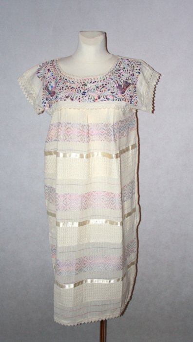 niezwykle oryginalna haftowana luźna sukienka z krótkim rękawkiem, przeplatana jasną wstążeczką, rękawki wykończone koronką, brak metki ze składem i rozmiarem
