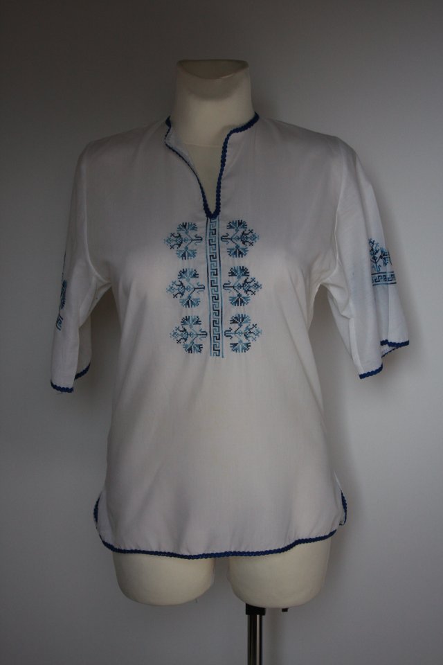 cienka prześwitująca haftowana bluzka w stylu boho, hippie, krótki, szeroki rękawek sięgający łokcia, rozcięcie przy dekolcie i malutkie rozcięcia po bokach bluzeczki