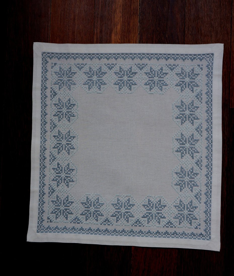 Bawełniana serwetka. Wykonana ręcznie. Bardzo staranny haft krzyżykowy. Bawełniane nici użyte do haftu w dwóch odcieniach pastelowego błękitu. Serwetka mocno usztywniona. Stan bardzo dobry.