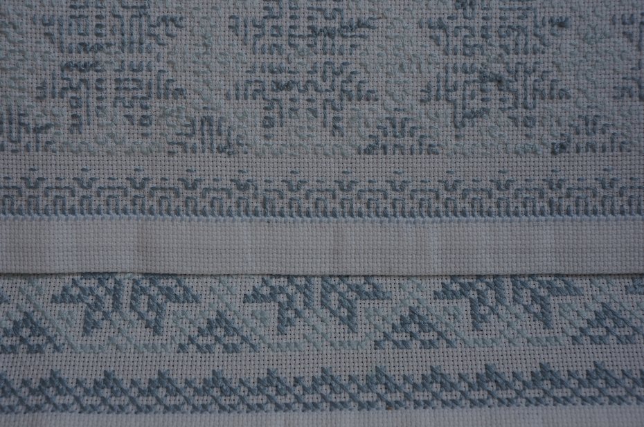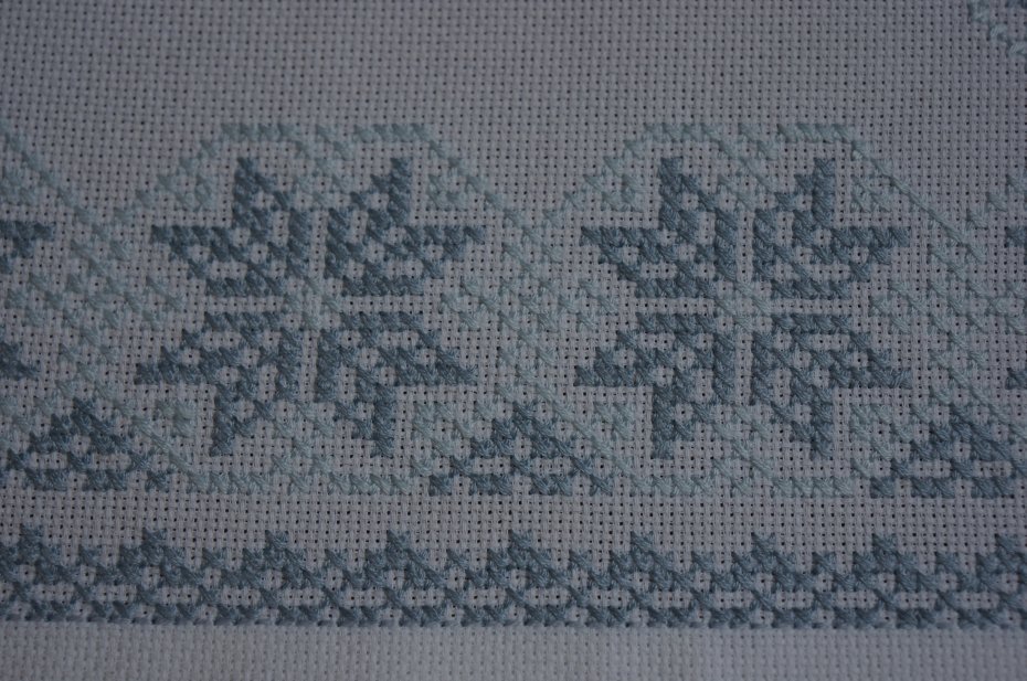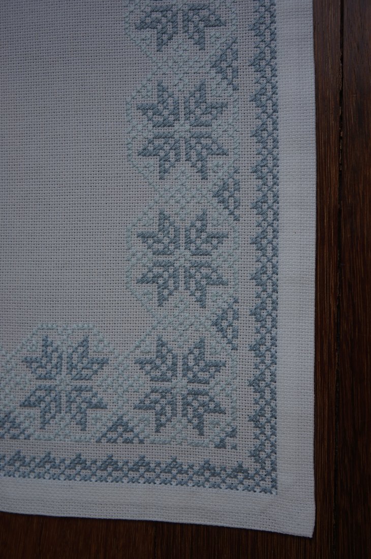 Bawełniana serwetka. Wykonana ręcznie. Bardzo staranny haft krzyżykowy. Bawełniane nici użyte do haftu w dwóch odcieniach pastelowego błękitu. Serwetka mocno usztywniona. Stan bardzo dobry.