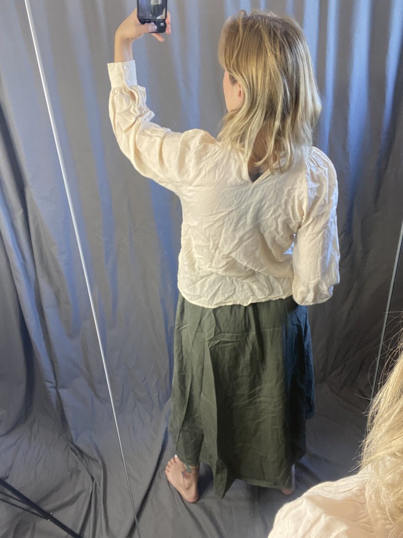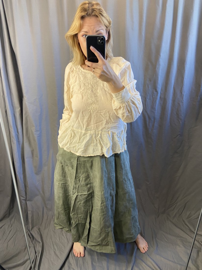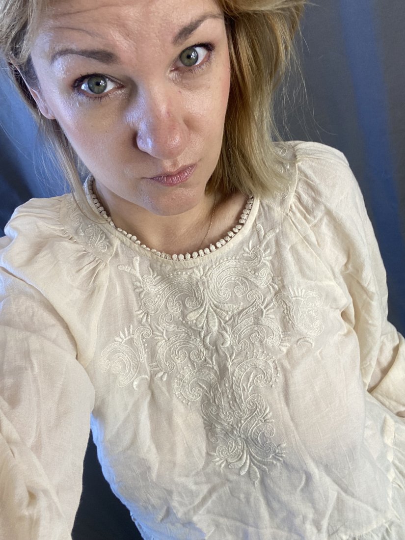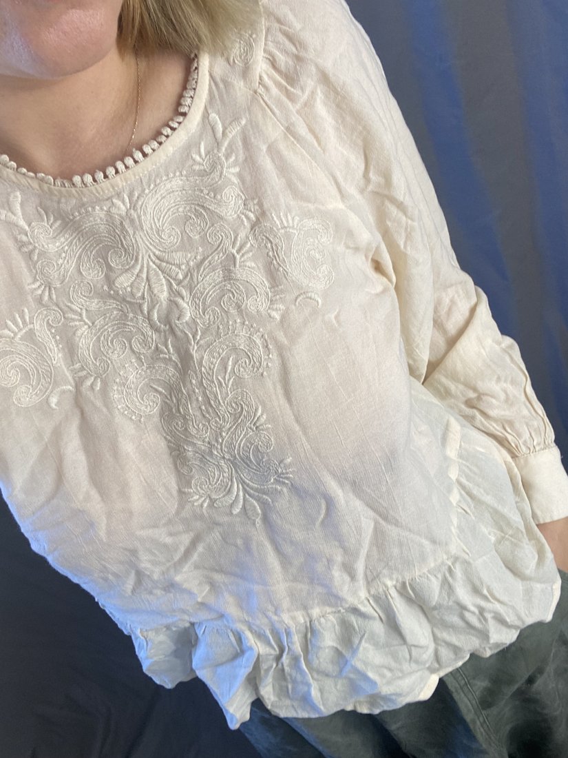 Haftowana tunika z zary. 55% wiskoza, 45% bawełna, nitka do haftowania poli.