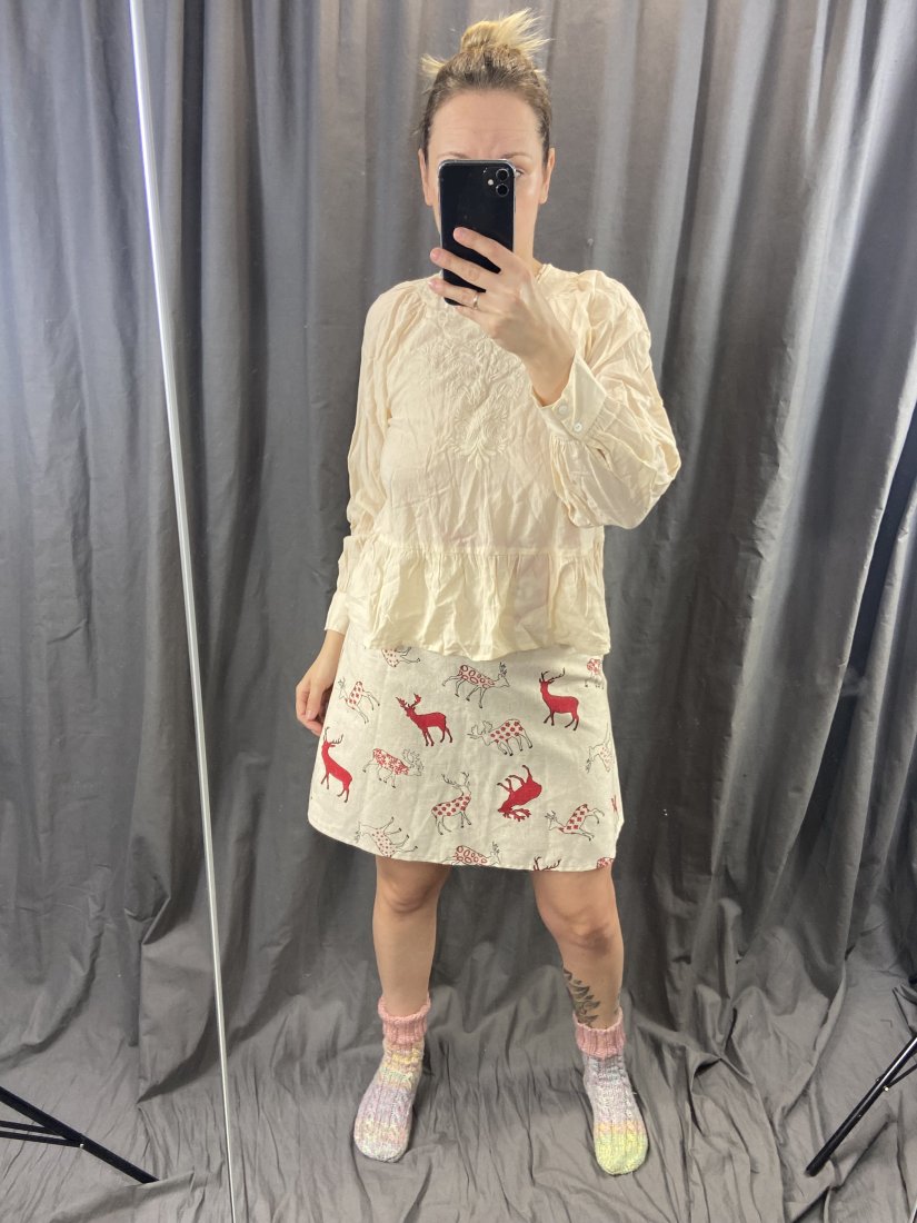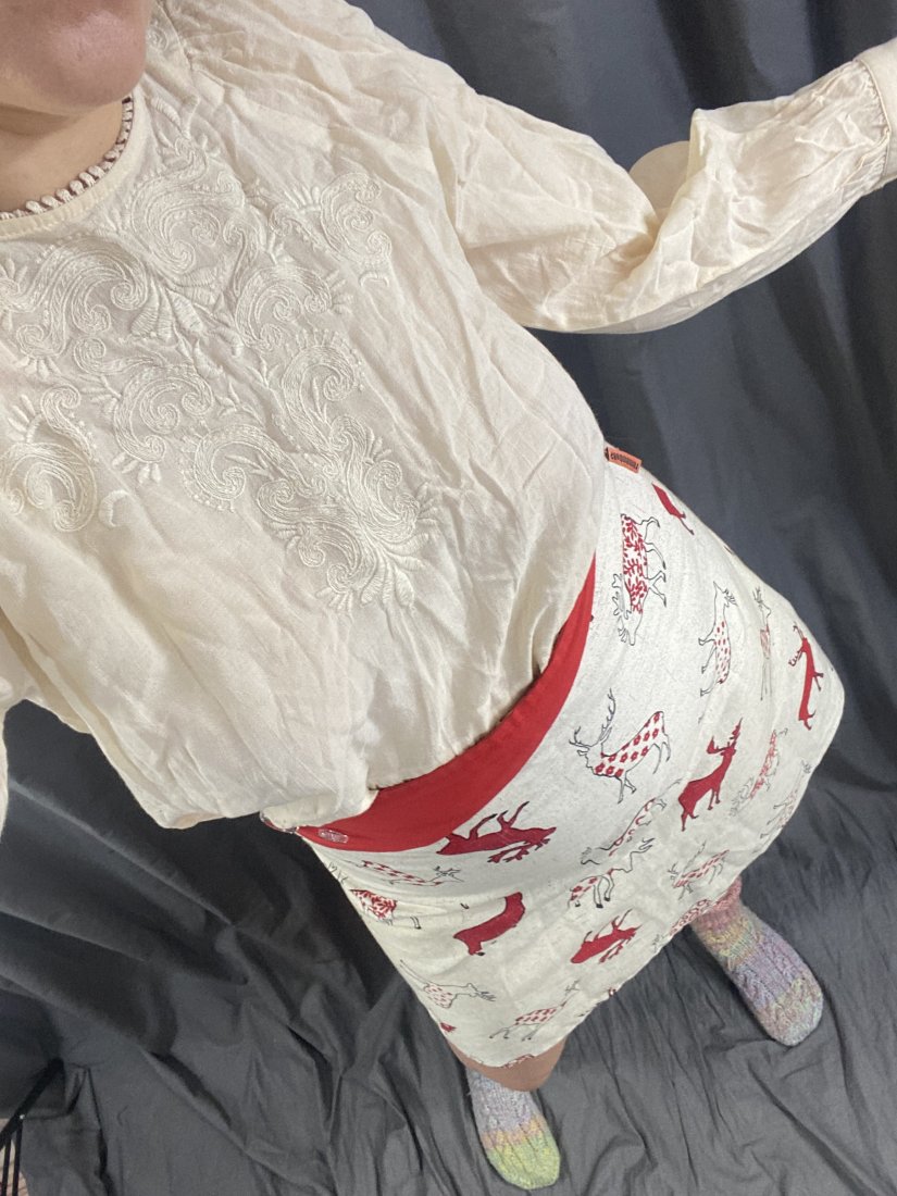 Haftowana tunika z zary. 55% wiskoza, 45% bawełna, nitka do haftowania poli.
