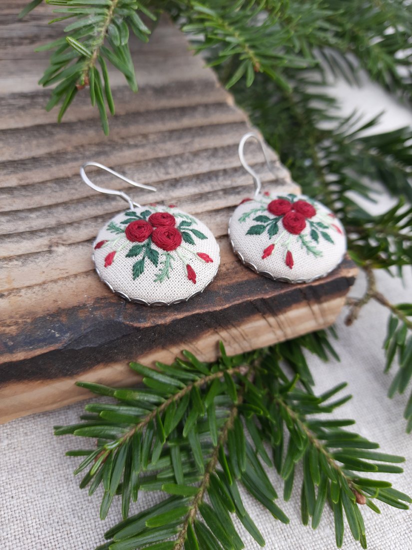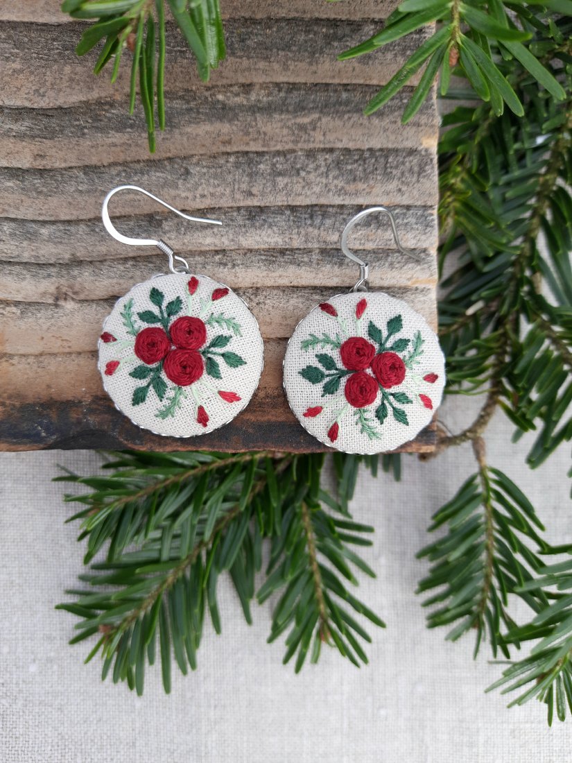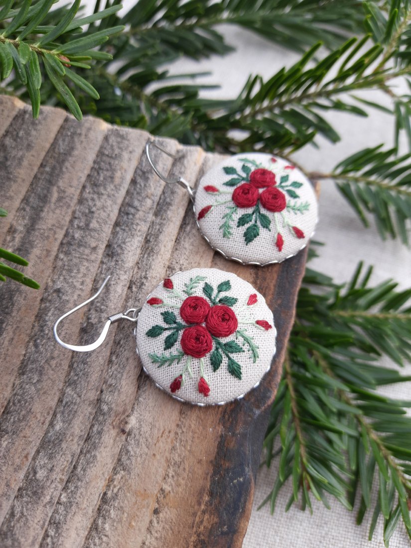 Kolczyki o średnicy 2,5 cm z ręcznie wyhaftowanym motywem kwiatowym w kolorze bordowym i różnymi odcieniami zieleni.