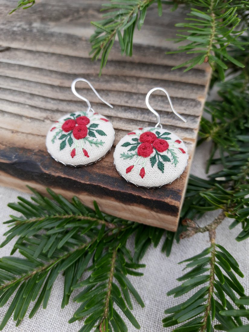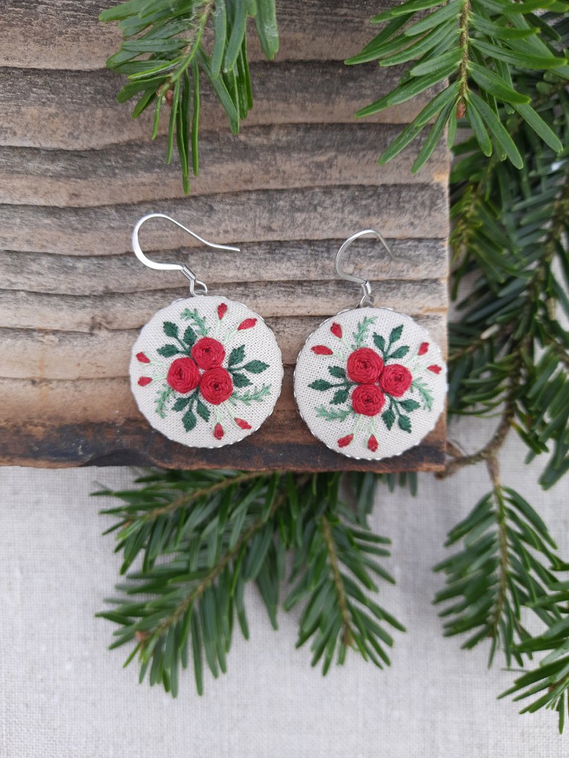 Kolczyki o średnicy 2,5 cm z ręcznie wyhaftowanym motywem kwiatowym w kolorze czerwonym i różnymi odcieniami zieleni.