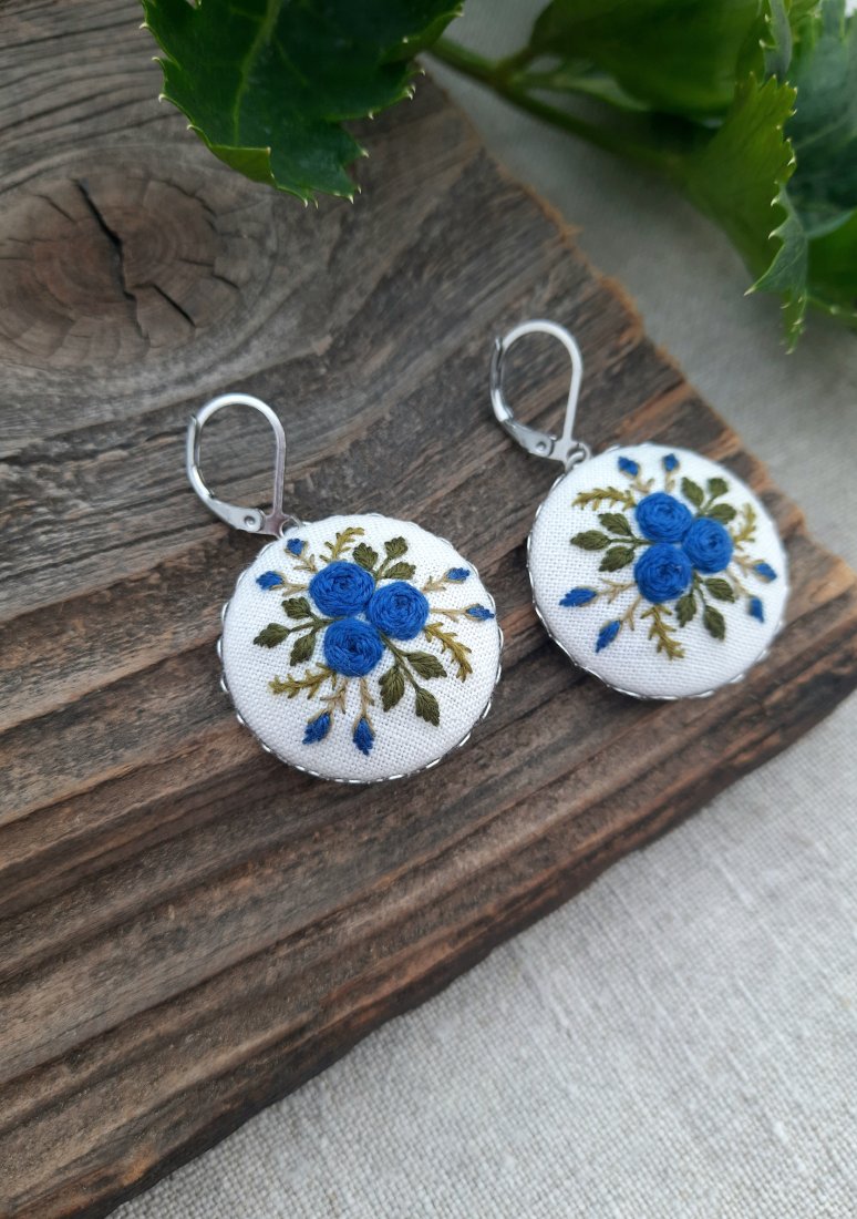 Kolczyki o średnicy 2,5 cm z ręcznie wyhaftowanym motywem kwiatowym w kolorze niebieskim i zielonym. Haft wykonałam na bawełnianej tkaninie. Baza i bigle angielskie są ze stali nierdzewnej.