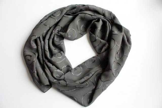 Grafitowy, haftowany szal ze zwiewnego materiału. Maleńki ubytek w materiale widoczny na zdjęciu. Materiał oceniam na wiskozę.