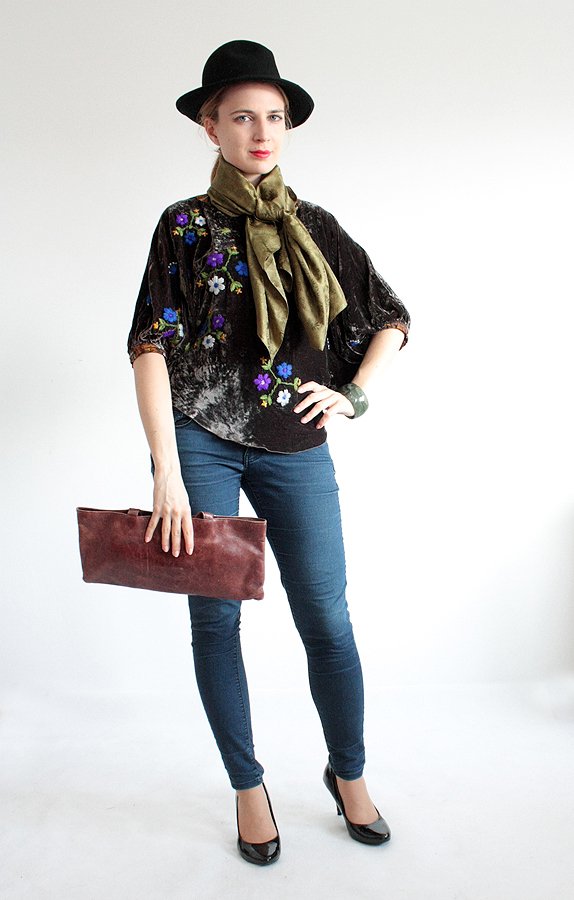 Unikatowa bluzka luksusowej orientalnej marki SENADA. Ciekawy, kimonowy krój, welurowa struktura nietypowa dla jedwabiu i kwiatowe hafty nadają bluzce niezwykłego charakteru. Dekolt zapinany na haftkę.