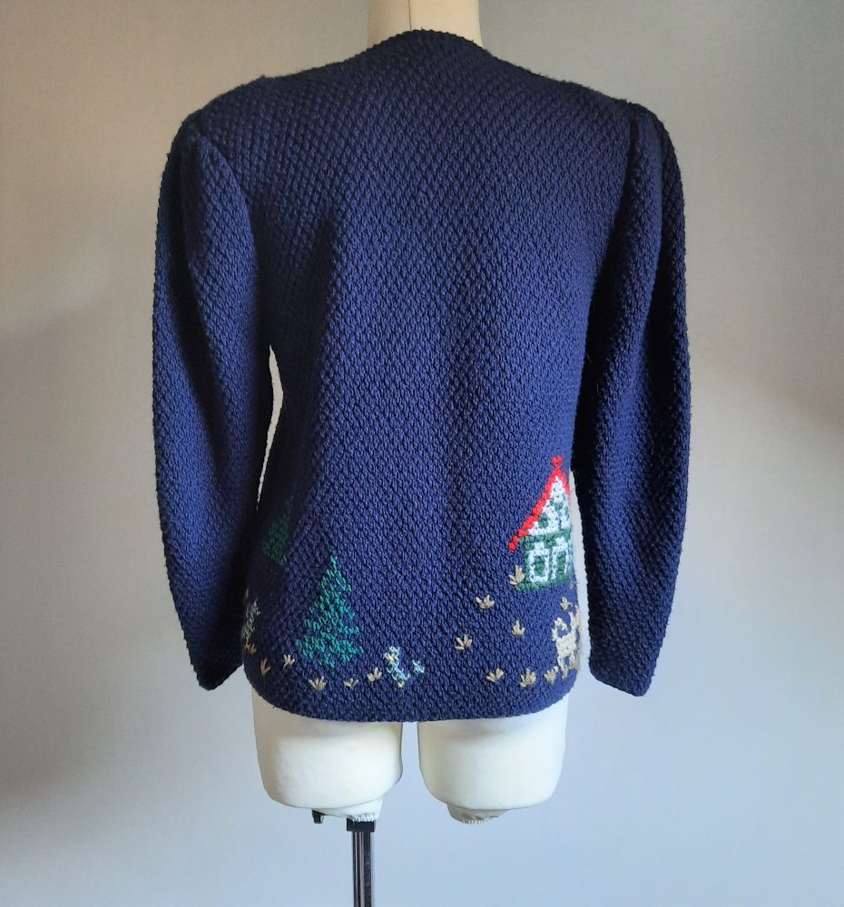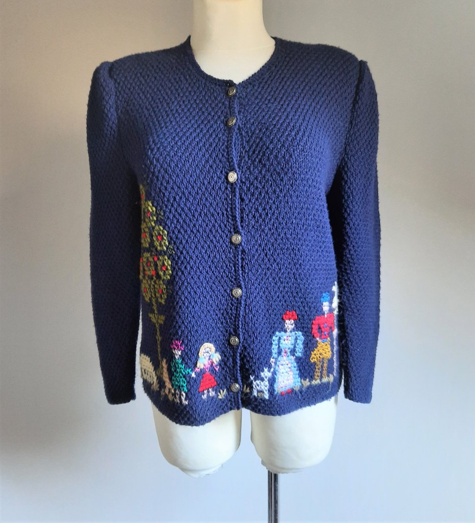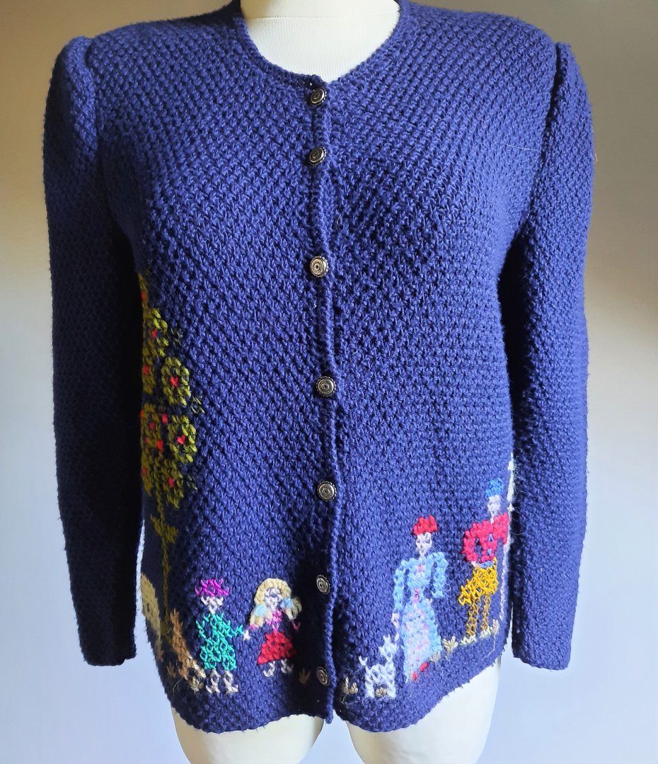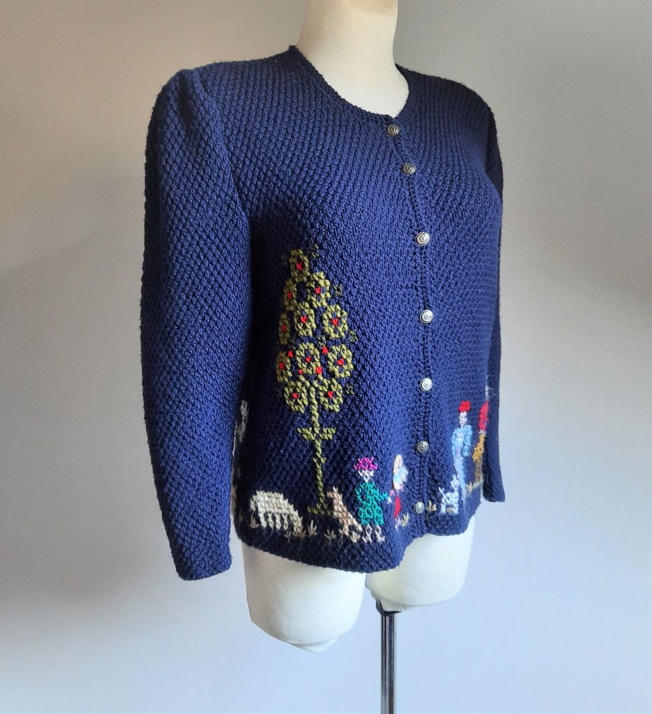 piękny wełniany kardigan vintage według mnie z lat 80-tych, w kolorze granatowym, kolorowy haft z motywem ludzi, drzew i zwierząt, długi rękaw, w ramionach bufki oraz poduszki, zapinany na ozdobne guziki, brak metek, wygląda na ręcznie robiony