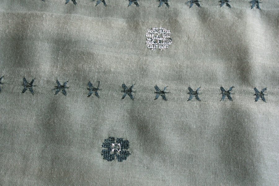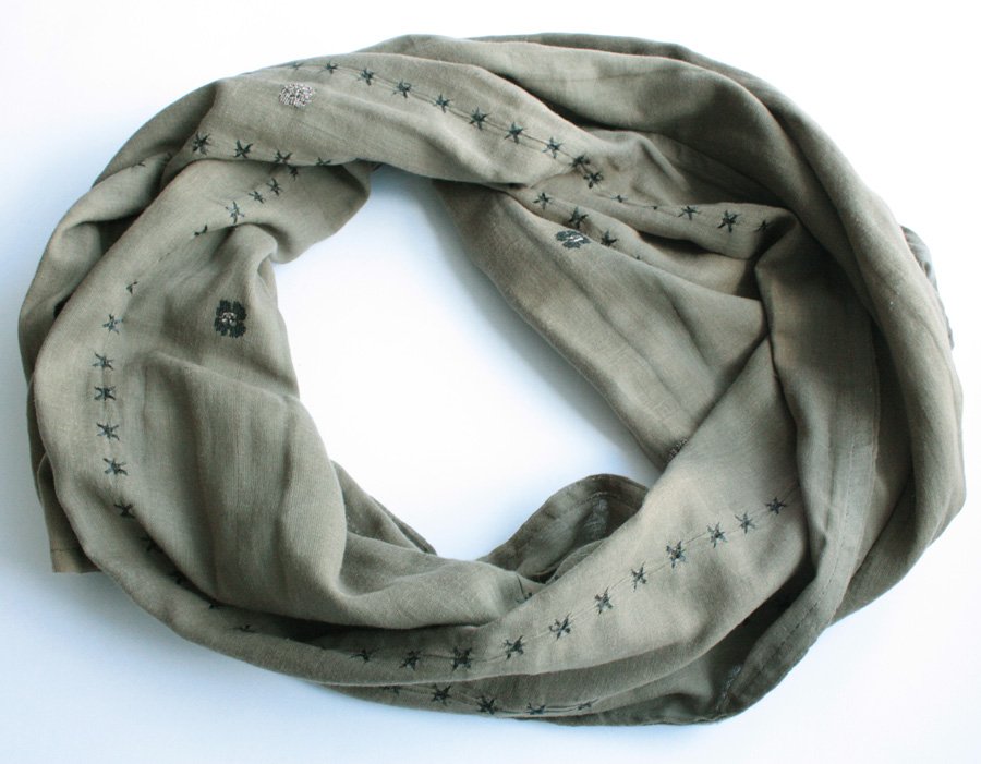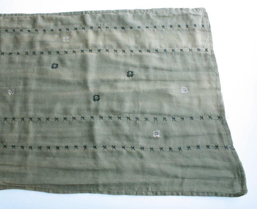Miękki szal w niejednolitym, cieniowanym kolorze, ozdobiony haftem. Wykonany z delikatnej, cienkiej bawełny. Szal jest dwustronny. Kolor to stonowana zieleń, khaki, wpadająca w szarość.