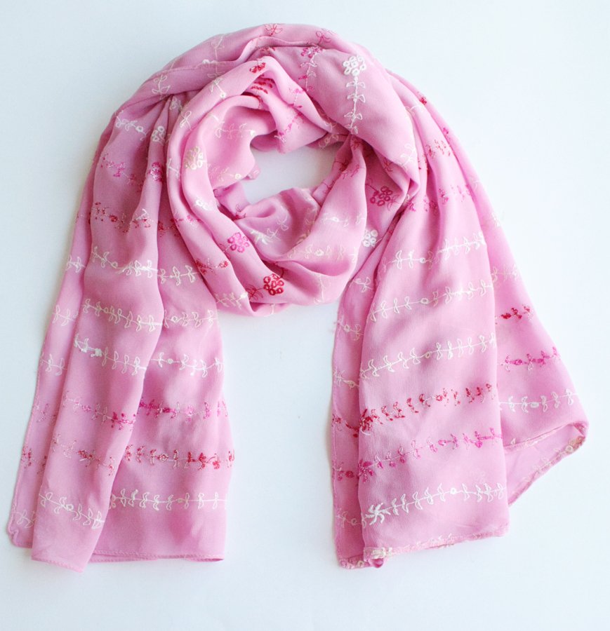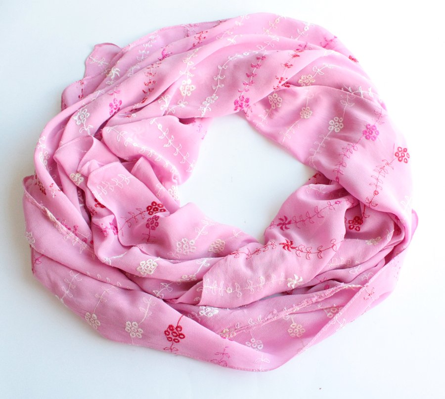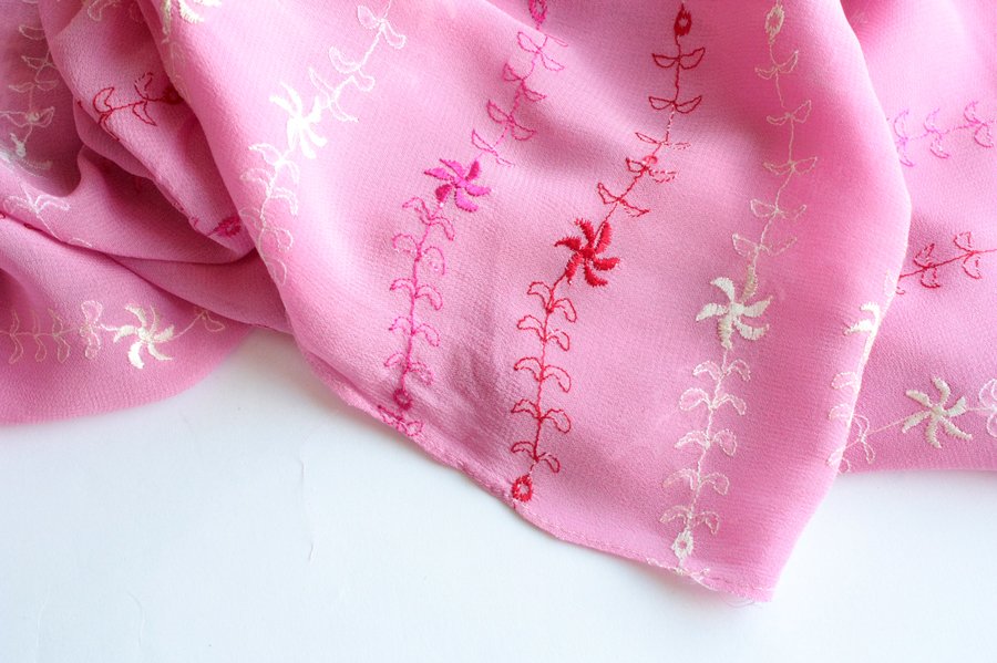Zwiewny, haftowany szal w pięknym odcieniu różu. Materiał oceniam na wiskozę.