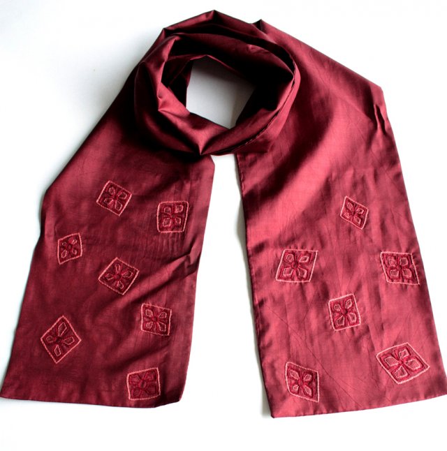 Bordowy, podwójnie zszyty szal ozdobiony ręcznymi haftami. Z jednej strony szal jest jednolity, bez haftów. Materiał to prawdopodobnie jedwab.
