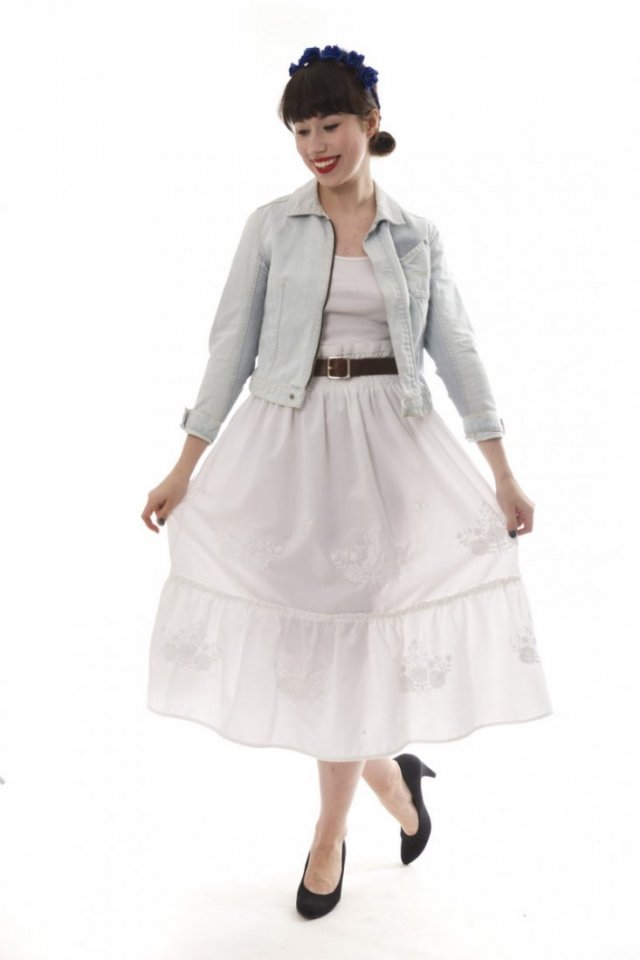 Wyjątkowa biała spódnica z ręcznie haftowanymi kwiatami, zapinana z boku na zamek, na dole jest falbanka. Spódnica uszyta jest z dość grubego bawełnianego płótna. Cudo.