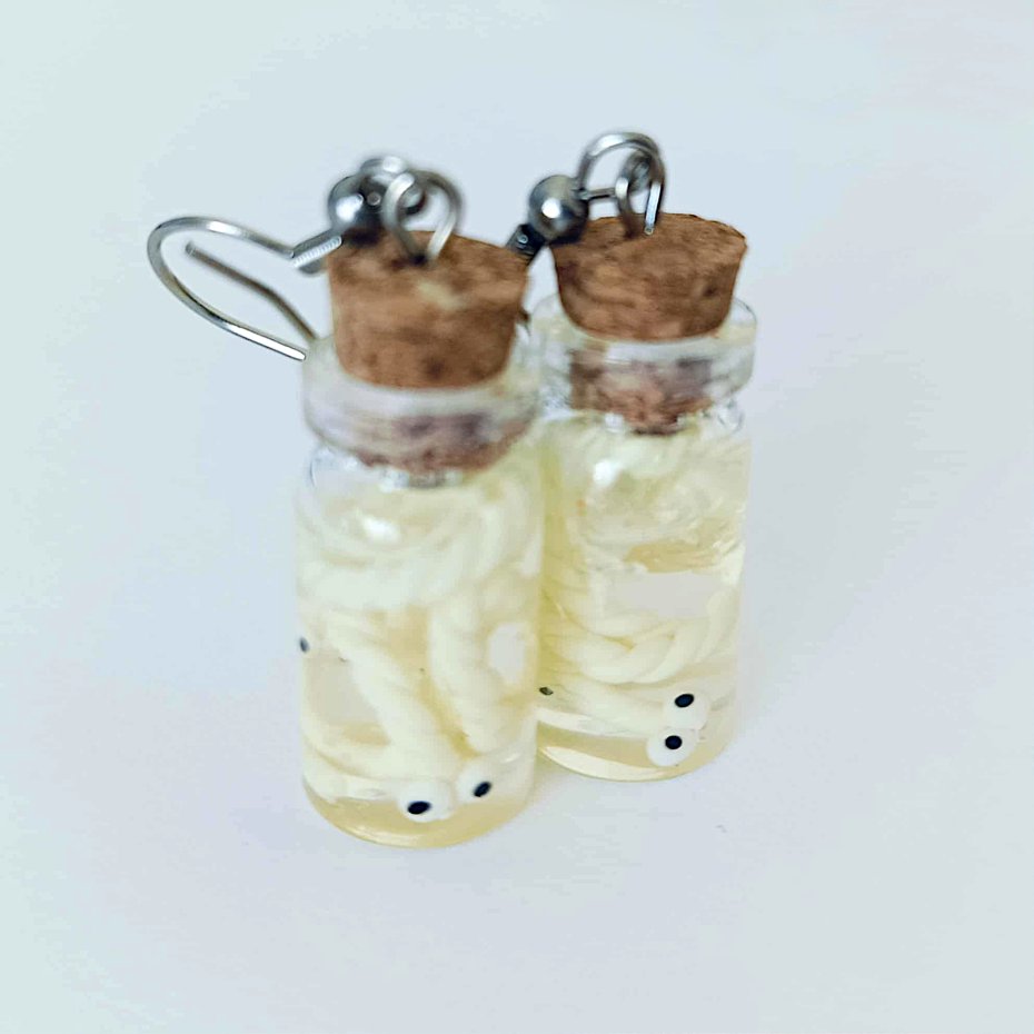Ręcznie wykonane kolczyki w formie miniaturowych szklanych buteleczek, w których zamknięto robale. To oryginalny i zabawnie upiorny dodatek, idealny na Halloween, imprezy tematyczne lub dla osób, które lubią nietuzinkową, ręcznie robioną biżuterię. Lekkie i wygodne w noszeniu, wniosą do stylizacji odrobinę humoru i halloweenowego klimatu.