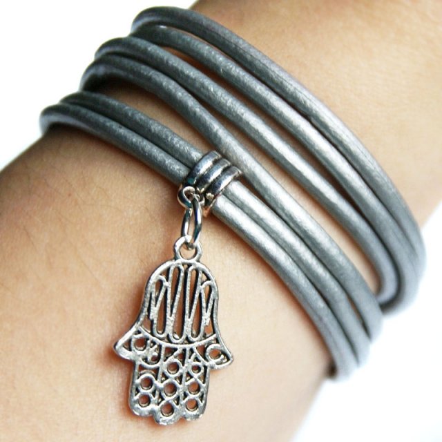 POMYSŁ NA PREZENT ;-) delikatna bransoletka wykonana z 3 rzemieni (3mm) ze 100% skórki naturalnej w odcieniach metalicznych/perłowych (TUTAJ: srebrny). długość regulowana za pomocą łańcuszka. BRANSOLETKA PASUJE NA NADGARSTEK OD 14,5CM. możesz ją nosić samodzielnie lub dowolnie łączyć z innymi bransoletkami z tej serii. świetnie prezentuje się też w zestawieniu z bransoletkami z kamieni naturalnych. ... HAMSA (RĘKA FATIMY) -dłoń dobrych, sprawiedliwych uczynków, chroni przed złem i chorobami, niesie szczęście i radość.... ZOBACZ CAŁĄ KOLEKCJĘ!!! ... MOJA BIŻU ZAWSZE PODRÓŻUJE OZDOBNIE ZAPAKOWANA ;-) ...