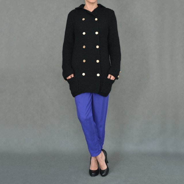 Ciepły czarny sweter hand made. Z grubej włóczki, zapinany na złote, wyraźne zdobione guziki, po bokach kieszonki. Zapinany na dwa rzędy. Na dole po bokach rozcięcia. Rękawki również przy końcach ozdobione guzikami. Idealny na chłody. Polecam.