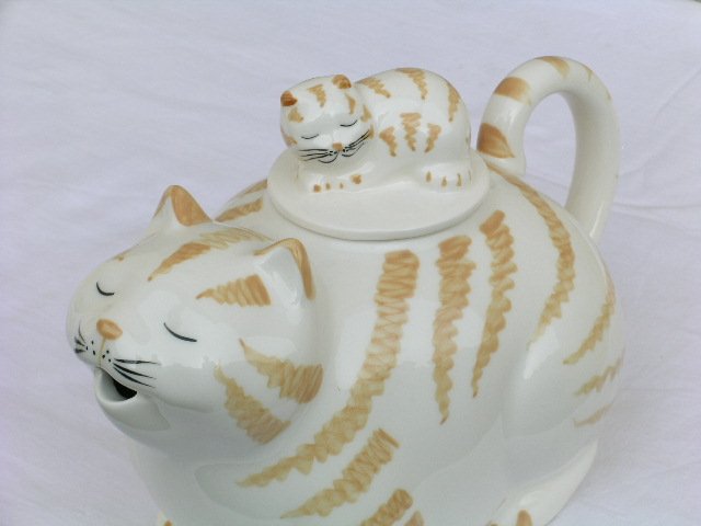 Duży porcelanowy dzbanek - bardzo z polotem :) Kocia przykrywka z języczkiem blokującym i koci pyszczek jako dziubek. Ręcznie malowany, na błyszcząco szkliwiony. W pełni użytkowy; nadaje się do zmywarki i mikrofali. Tajlandzkie rękodzieło z radosną wyobraźnią :) Wygodny, praktyczny, ozdoba stołu i uśmiech przy śniadaniu. 22 x 13,5 x 16 cm. Stan zachowania bardzo dobry.