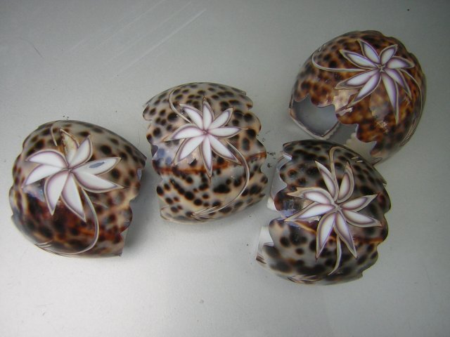 Niesamowite cztery serwetniki ręcznie z muszli wykonane. Ciekawie zdobione. Precyzyjnie wykonane kwietne zdobienie, oraz falbankowość rantów wręcz niewiarygodne, że ludzką ręką w tak twardej materii jaką są muszle, takie cuda urzeźbić można. Każdy nieco inny, ale też muszle nie fabryczne jeno przez naturę stworzone. Ciekawe, oryginalnej inne.