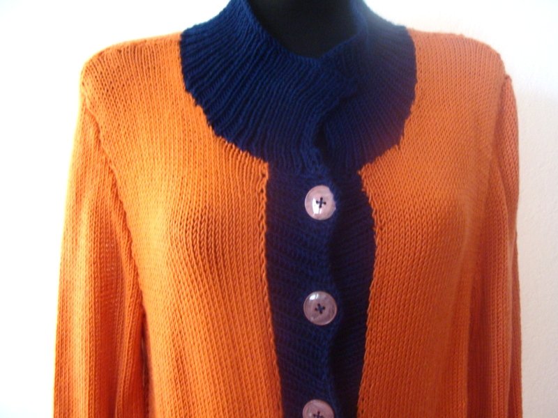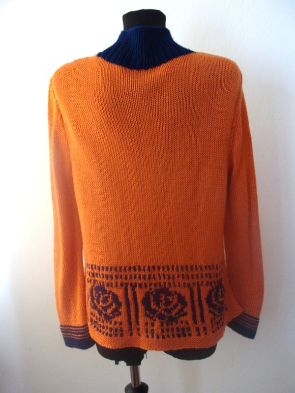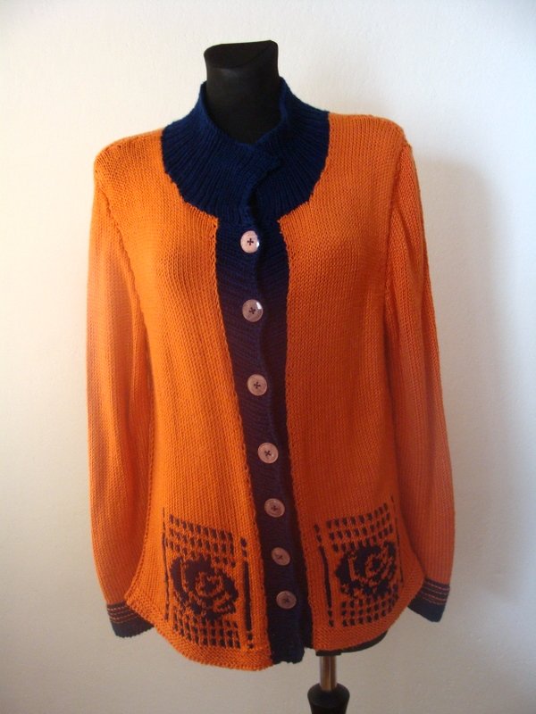 Wzorzysty sweter w energetycznym pomarańczowym kolorze z kwiatowym wzorem i wykończeniami w granatowym kolorze. Z kołnierzykiem , zapinany na całej długości na ozdobne guziki. Podatny, miły i rozciągliwy.