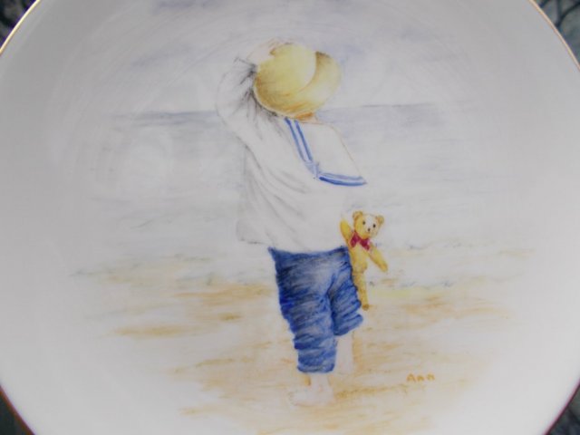 Ręcznie wykonany napis - sygnatura na rewersie...HAND PAINTED BY ANN BROAD 1994. Jakościowa,biała porcelana na błyszcząco szkliwiona. Rant złocony. Malunek pięknie wykonany, podszkliwny. Dokładam Profesjonalny Uchwyt do powieszenia,bowiem dekoratorsko fantastyczna do rzecz i unikatowa ;)