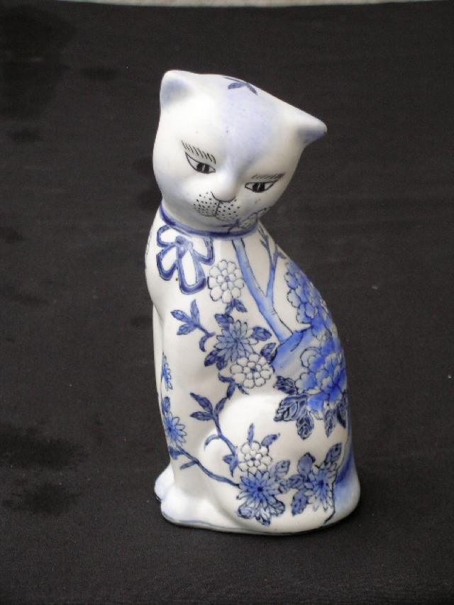 Zjawiskowy Kot porcelanowy... Japońskie rękodzieło - artystyczny odlew i niewiarygodne ręczne malowanie w niebieskościach. Fakturowość kwiatowego zdobienia. Ale przede wszystkim to spojrzenie - pełne spokoju, szlachetnego zamyślenia, niemal ludzkie... Bardzo wyjątkowa to rzecz, bardzo wyjątkowa to Kocia Osoba :) Głowa na satynowo szkliwiona, tułów na błyszcząco. Figurka lekka, szlachetna. 8 x 7 x 18 cm. Stan zachowania bardzo dobry. Unikat.