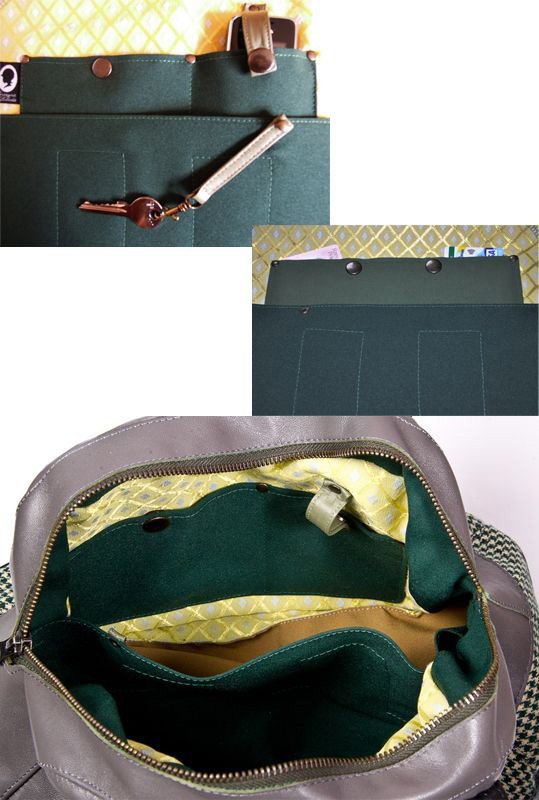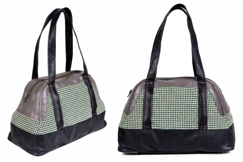 Torebka wykonana z trzech rodzajów skóry naturalnej w połączeniu z wełnianą tkaniną z domieszką. By rączki były mocniejsze w ich wnętrze wprowadzony został gumowo plastikowy pas. Zapinana na metalowy zamek. Dno usztywnione, wyposażone w cztery metalowe nóżki. W środku podszewka z przegródką dzielącą torebkę na pół. Do przegródki przymocowany pasek z ekoskóry z karabińczykiem do przypinania np. klucza. Po obu stronach torebki kieszenie: 1) jednoczęściowa, zapinana na dwie napy 2) dwuczęściowa z jedną częścią zapinaną na napę i drugą z napą na pasku do zapinania komórki. Brzegi kieszeni wzmocnione nitami. Kieszenie i przegródka usztywnione gumowo plastikowym materiałem.