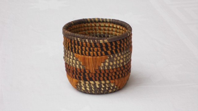 Ręcznie robiona osłonka na szklankę lub po prostu koszyczek, np. na ołówko-kredki na biurku. Przyjemny, bo w całości naturalny, misternie przez kogoś wypleciony :) Średnica 7,5; wysokość 7 cm. Stan zachowania dobry plus.