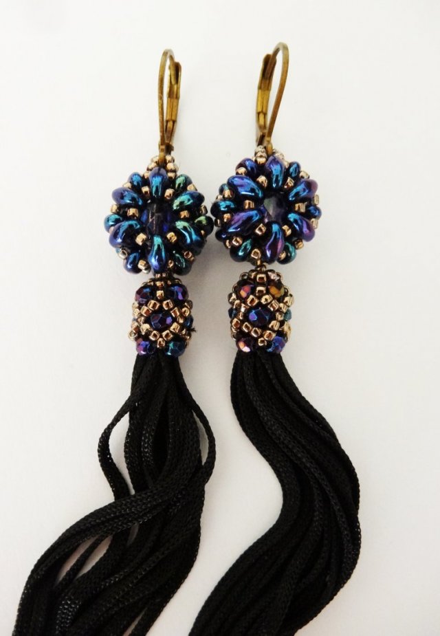 Kolczyki wykonane pracochłonną techniką beading. Stworzone przy użyciu koralików Super Duo w odcieniach niebiesko-fioletowych i złotych koralików TOHO. Efektowny chwost można skrócić samemu nożyczkami do pożądanej długości, nie strzępi się. Kolczyki zawieszone są na miedzianym biglu angielskim.
