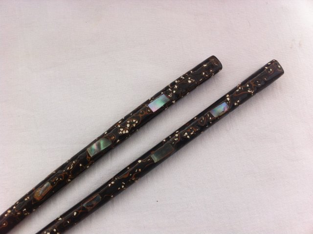 Oryginalne orientalne pałeczki - ręcznie wykonane i zdobione. Masa perłowa, inkrustacja i przyjemna krzywizna ręcznego wykonania. 22,5 cm długie. Stan zachowania bardzo dobry.