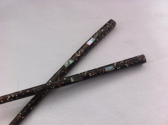 Oryginalne orientalne pałeczki - ręcznie wykonane i zdobione. Masa perłowa, inkrustacja i przyjemna krzywizna ręcznego wykonania. 22,5 cm długie. Stan zachowania bardzo dobry.