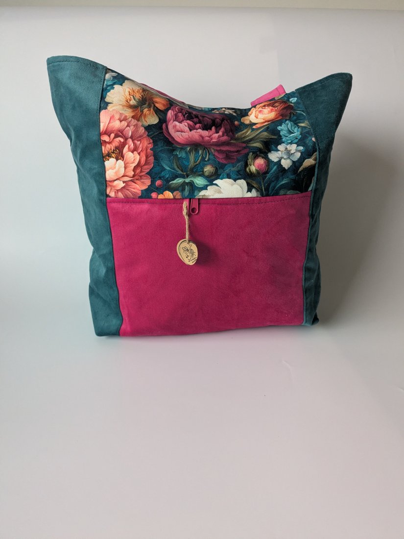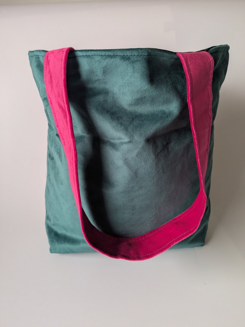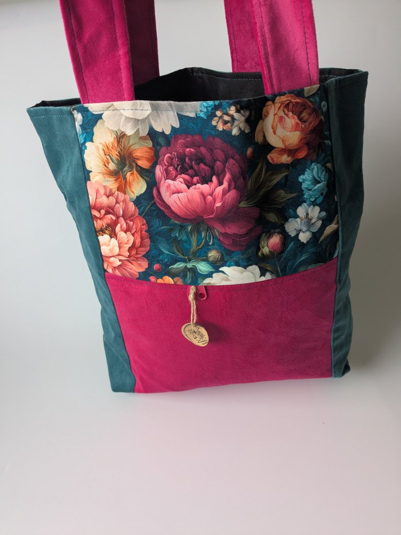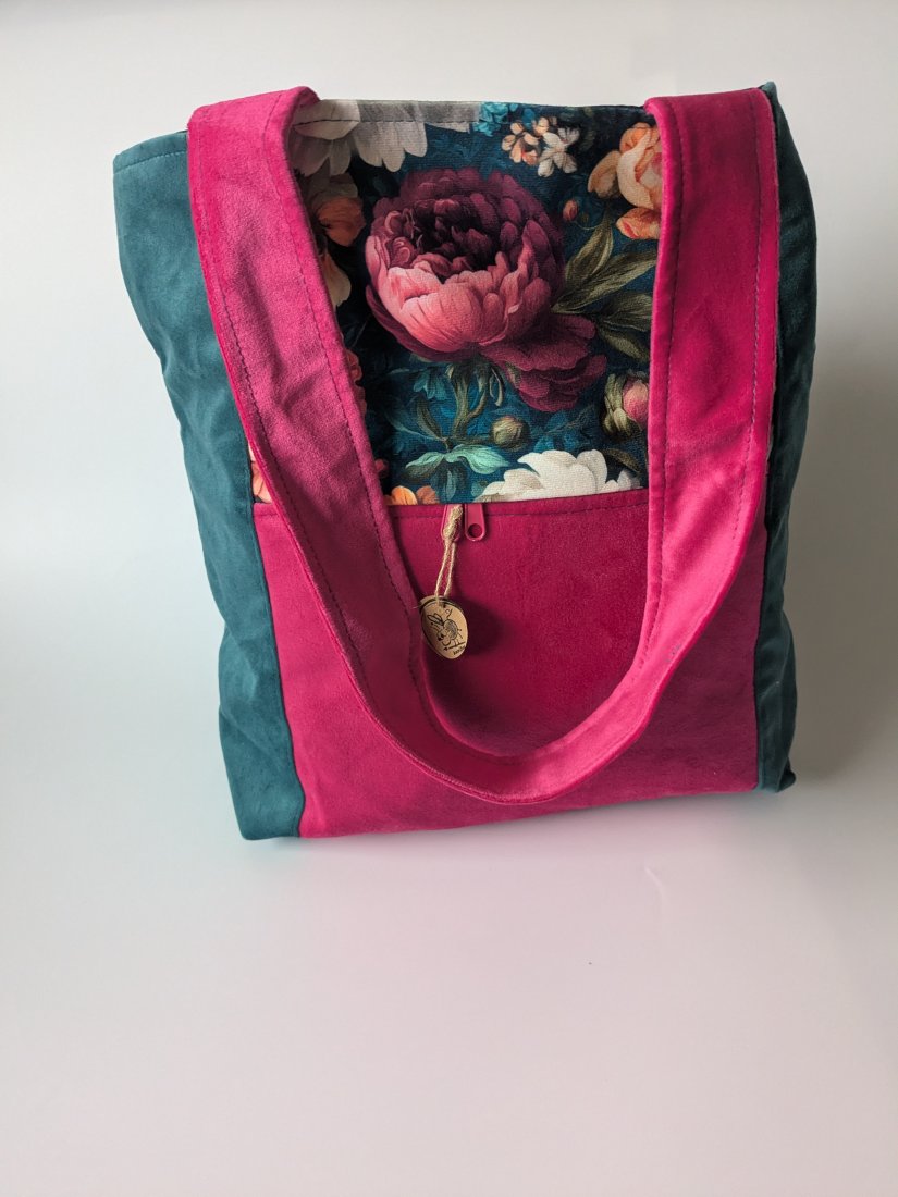 Torba wykonana z weluru, podszewka uszyta z czarnej tkaniny wodoodpornej. Pomieści format A4.
