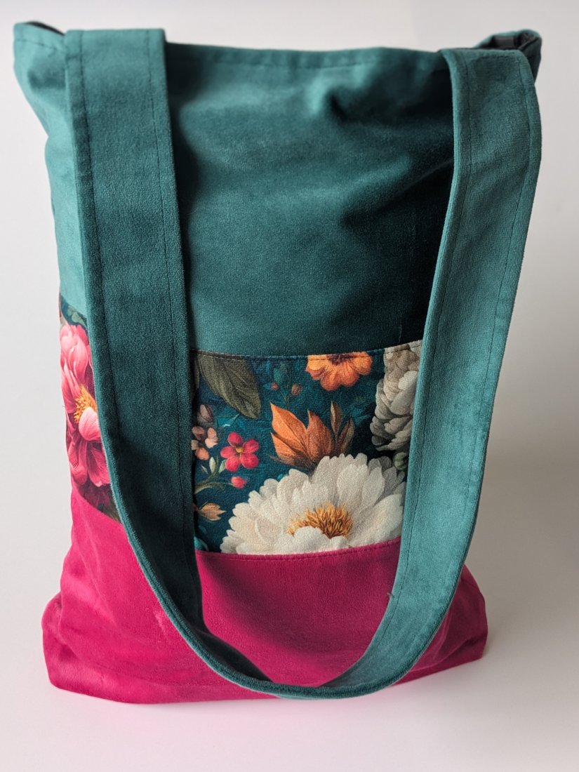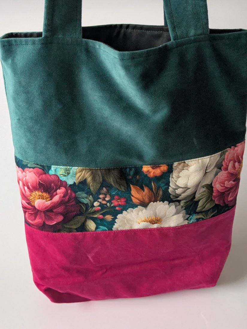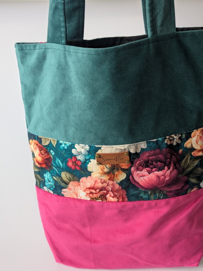 Torba wykonana z weluru, podszewka uszyta z czarnej tkaniny wodoodpornej. Pomieści format A4.