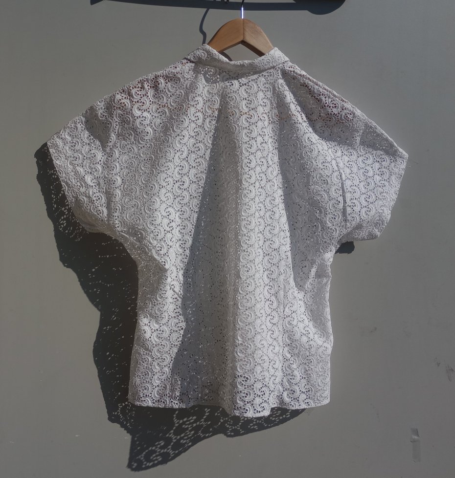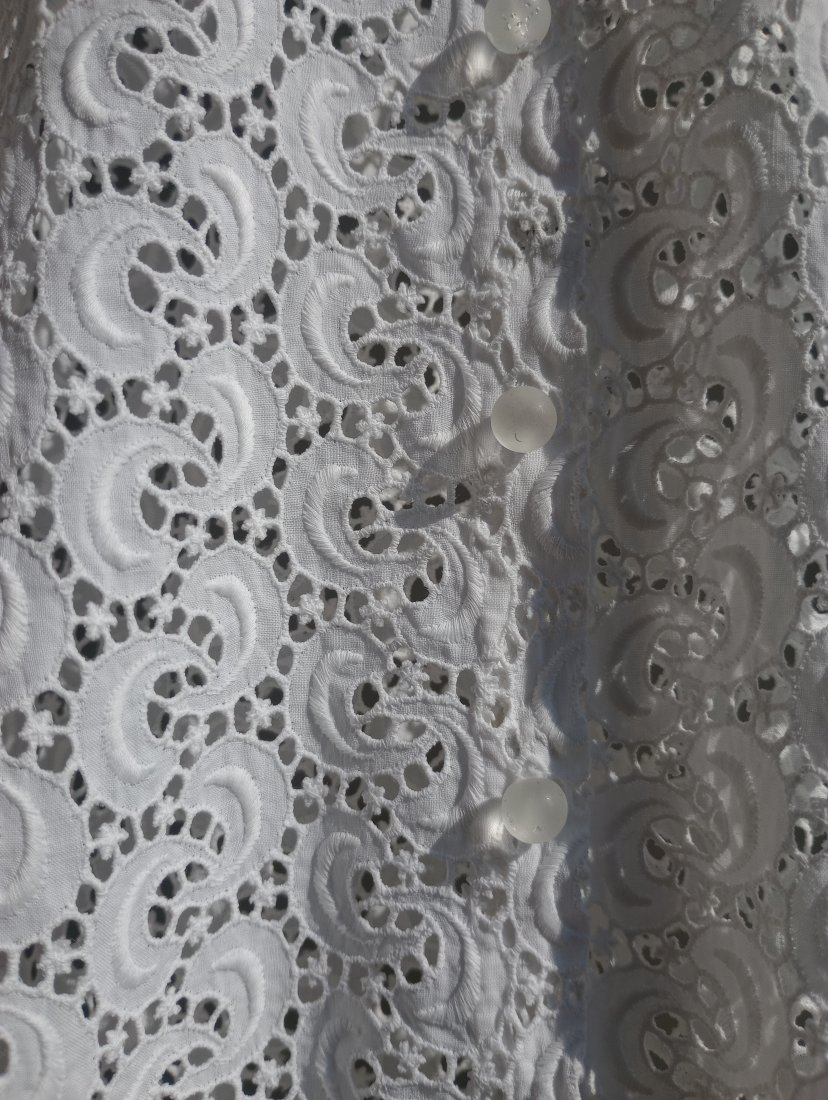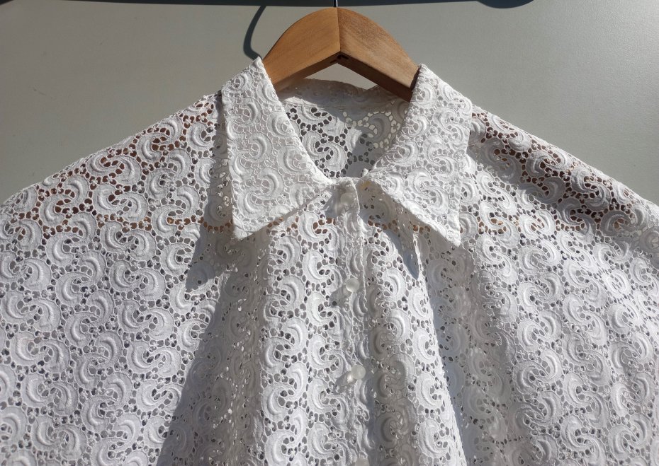 Bluzka handmade true vintage z białej koronki. Zapinana na zatrzaski. Na zewnątrz naszyte perłowe guziki.