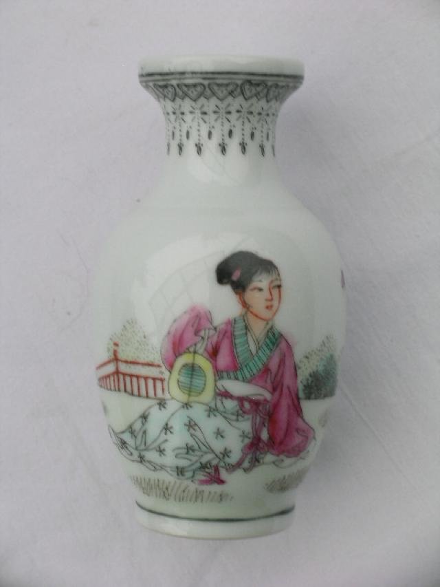 Urokliwy porcelanowy wazon, sygnowany, chiński, szlachetnie ręcznie malowany - wyrazistość cieniutkiej kreski i kobiecość barw. Klasyczna forma. Błyszczące szkliwienie tła i satynowość zdobienia. Dół 3,5; pękatość 6; wysokość 10,5 cm. Stan zachowania bardzo dobry.