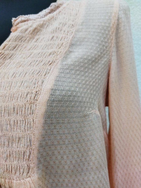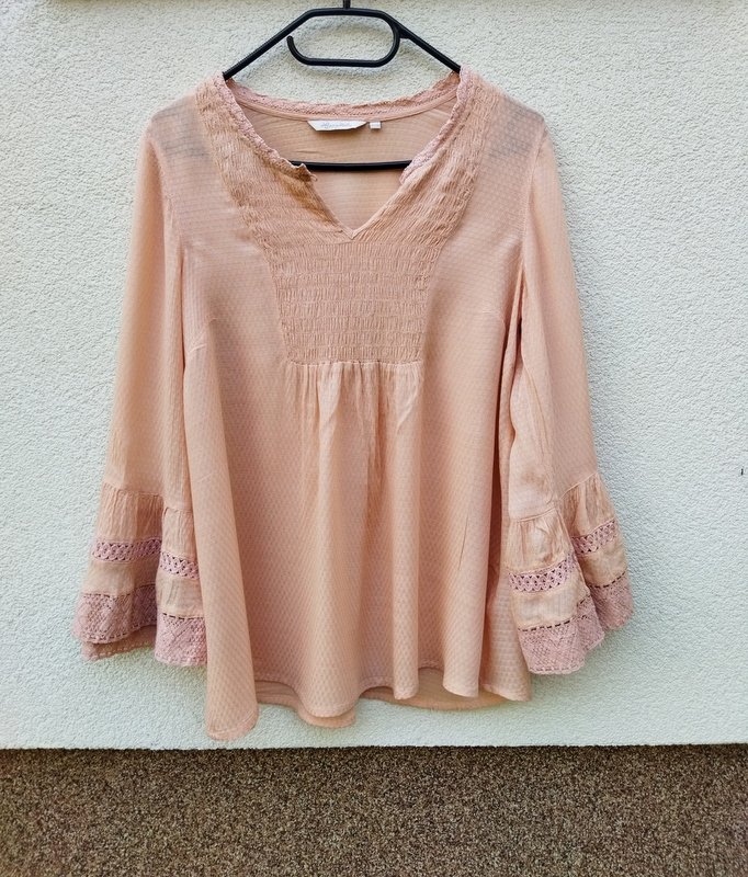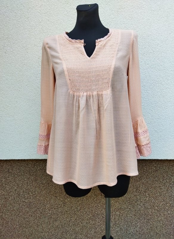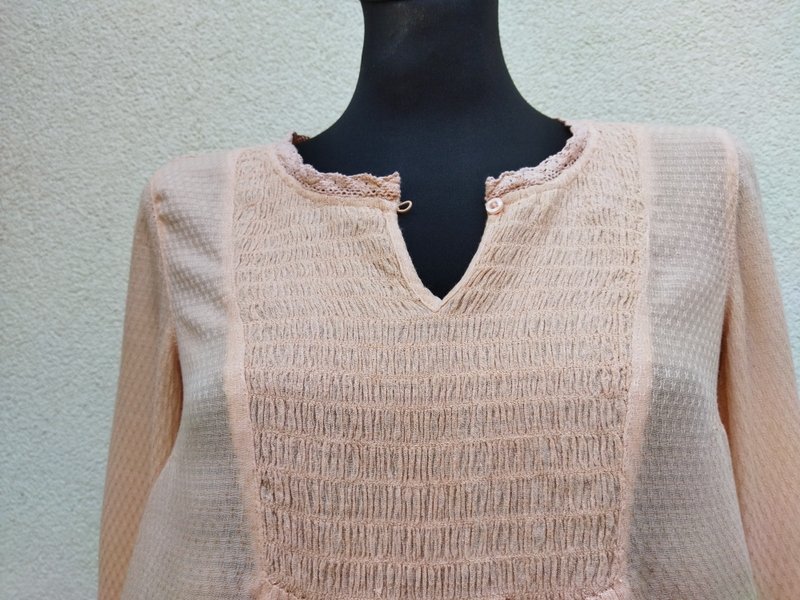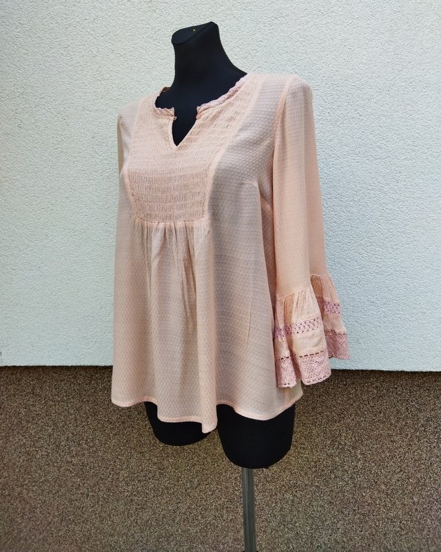 Bluzka z przewiewnej tkaniny wiskozowej w wytłaczany wzorek w brzoskwiniowym kolorze. Dekolt obszyty wąską bawełniana koronka , z rozcięciem zapinanym na guziczek i drapowaną gumonitką wstawką - od wstawki miejscowe marszczenie. Rękawy z ozdobna falbana z bawełniana koronka.