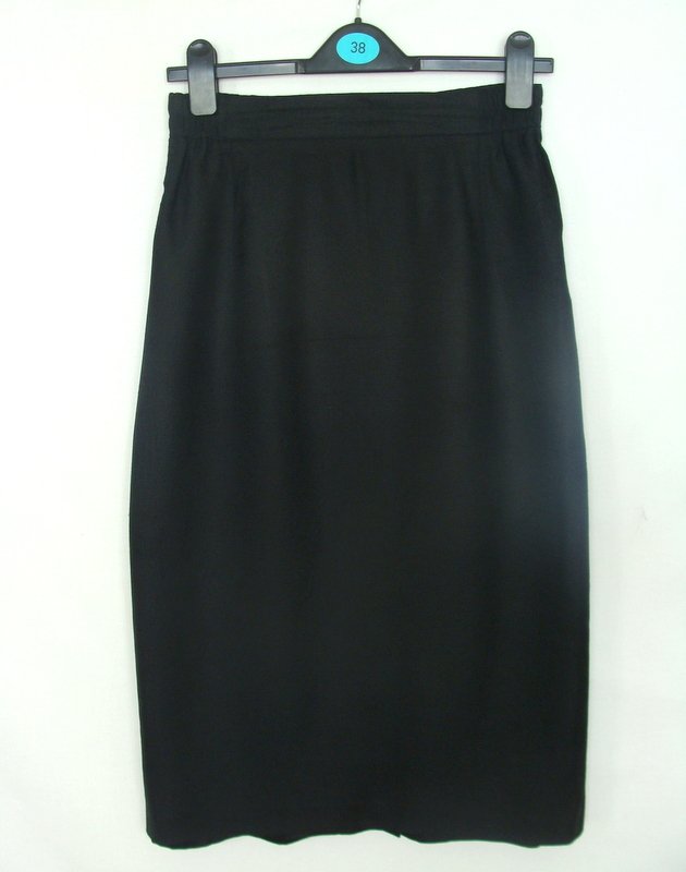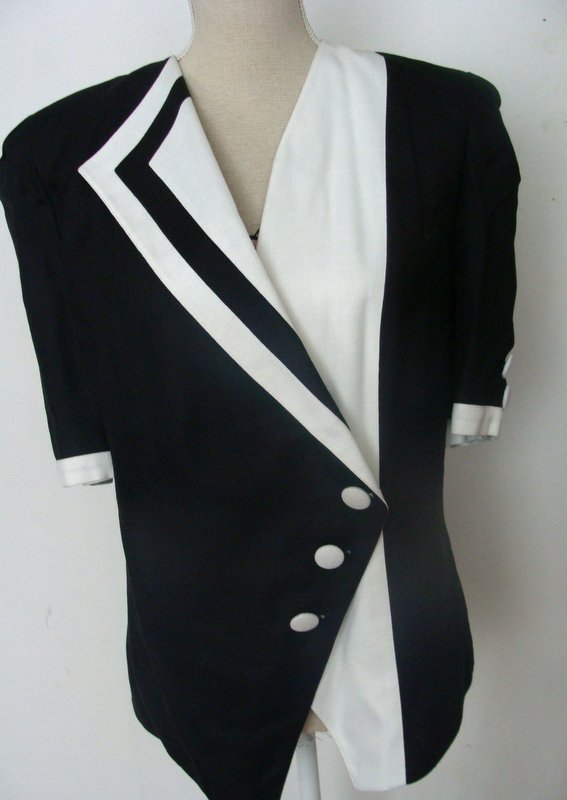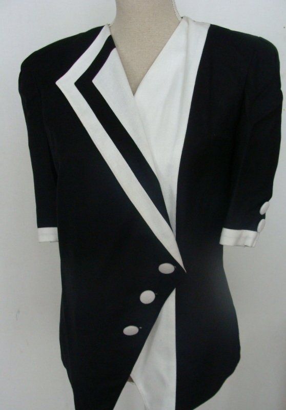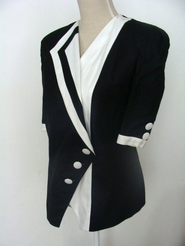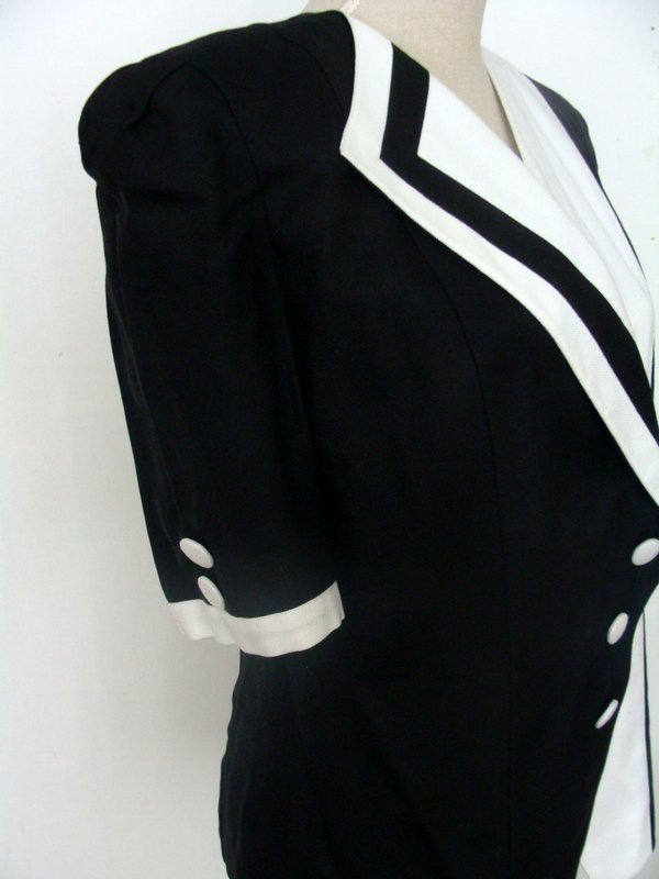 Ciekawy komplet z wiskozowej tkaniny o płóciennym splocie w czarnym kolorze z białymi dodatkami. Dekolt w szpic z jednym biało-czarnym rewersem. Asymetryczne zapięcie na białe obciągane tkaniną guziki, takie same na mankietach rękawków, Poły przodu spiczaste, ukośnie ścięte , dłuższe od tyłu. Spódnica ołówkowa z rozcięciem z tyłu. Usztywniony pasek z wszytą gumą po bokach. Zapinana na zamek. Całość na podszewce.