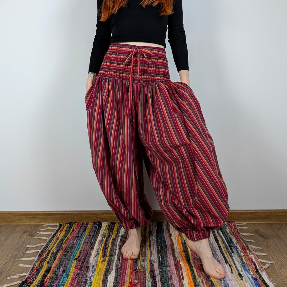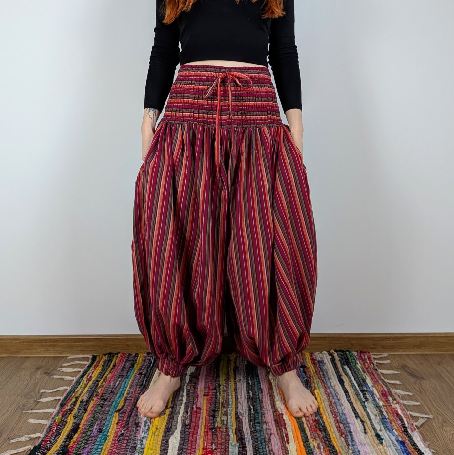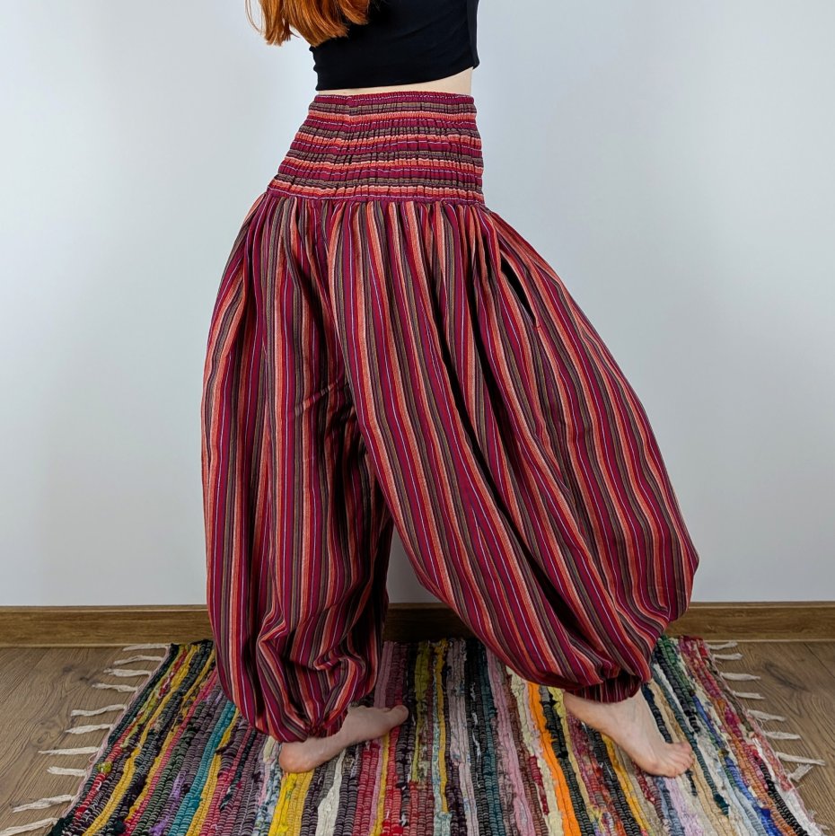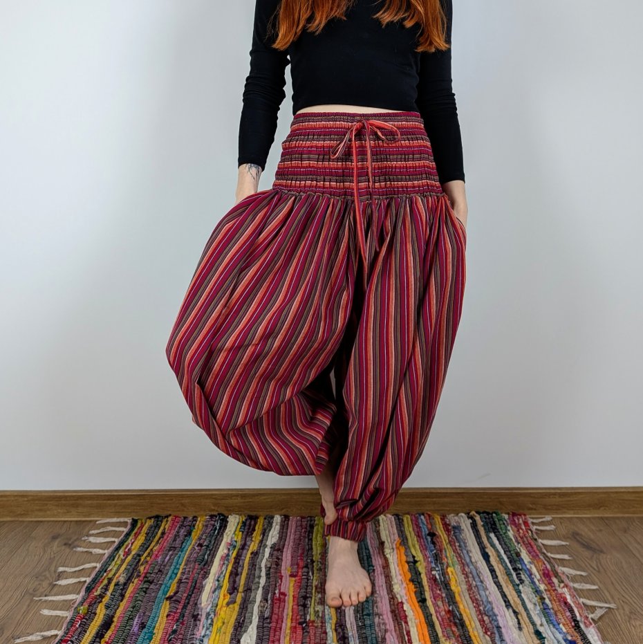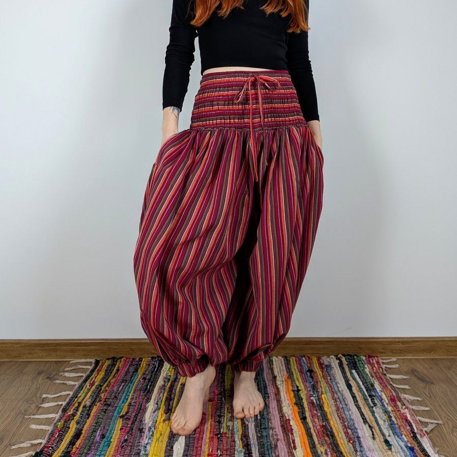 wyjątkowe haremki w wielobarwne, etniczne paski, sprowadzone prosto z nepalskich wzgórz. idealny wybór dla osób ceniących luz, oryginalność i klimat hippie/boho. lekkie, przewiewne i niezwykle wygodne – stworzone z myślą o letnich przygodach, jodze i codziennym chillowaniu.