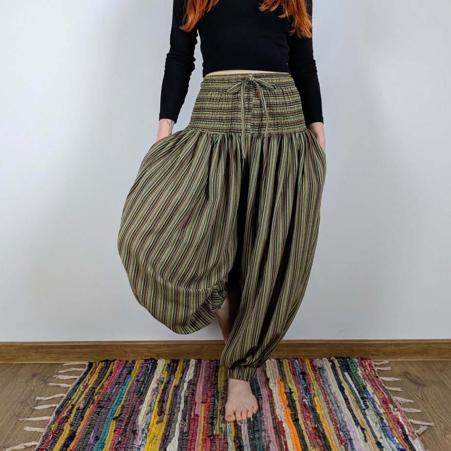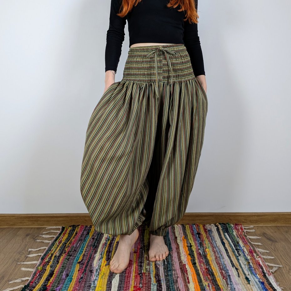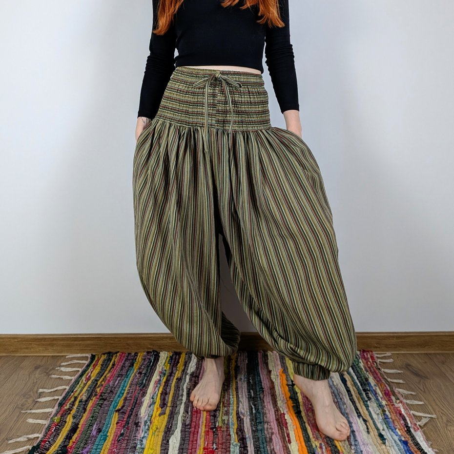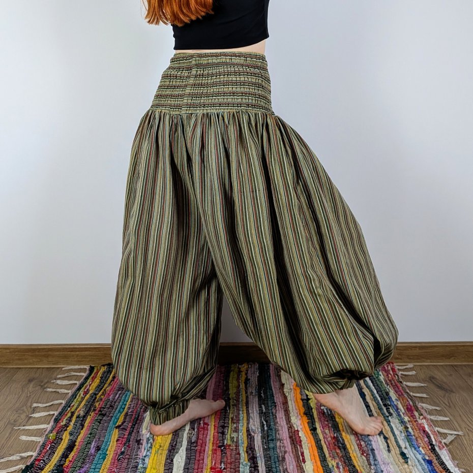 wyjątkowe haremki w wielobarwne, etniczne paski, sprowadzone prosto z nepalskich wzgórz. idealny wybór dla osób ceniących luz, oryginalność i klimat hippie/boho. lekkie, przewiewne i niezwykle wygodne – stworzone z myślą o letnich przygodach, jodze i codziennym chillowaniu.