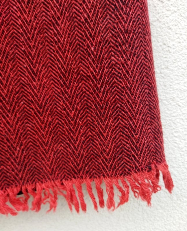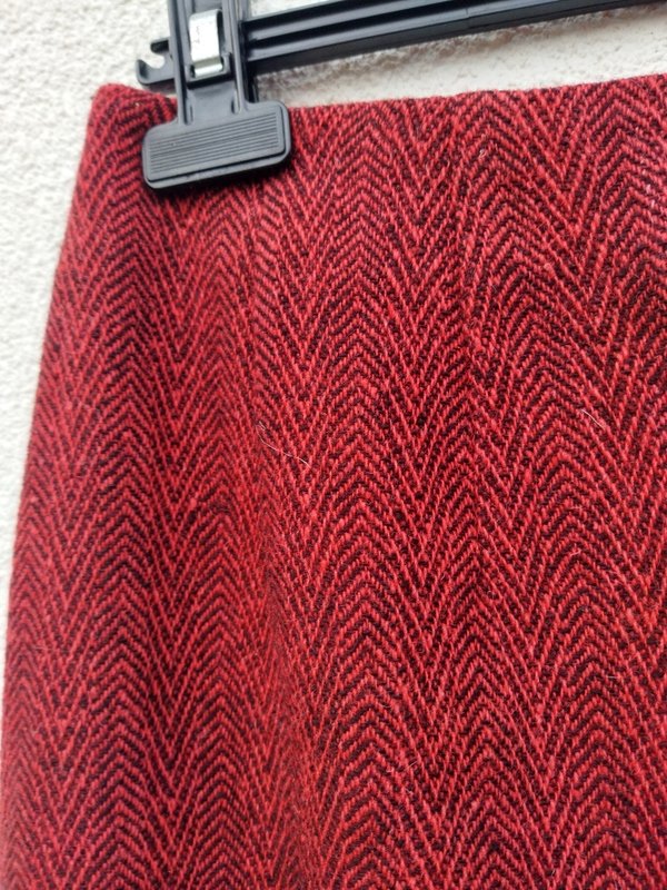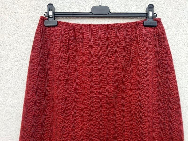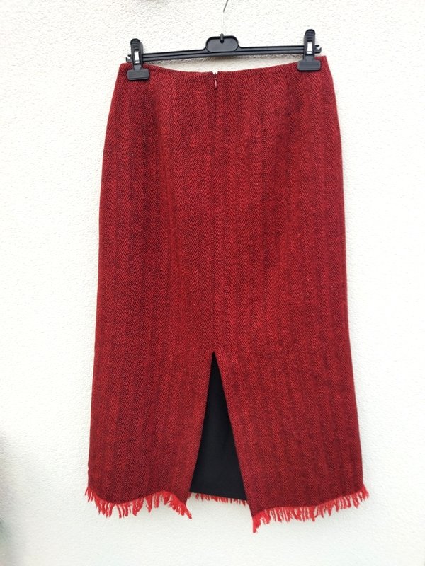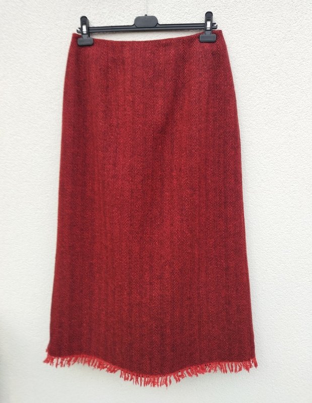 Ołówkowa spódnica z wełnianej tkaniny w czerwono-czarną jodełkę, , wykończona czerwonymi frędzelkami wyciąganymi z tkaniny. Zapinana z tyłu na zamek i od środka na guzik , z rozcięciem u dołu. Na podszewce.