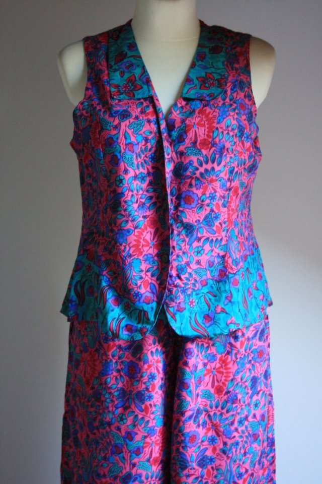 mega kolorowy komplet prosto z Hawajów składający się z topu bez rękawów, zapinanego na guziki, z kołnierzykiem, w skład dołu wchodzą długie szerokie spodnie z gumką w pasie i dwiema kieszeniami po bokach