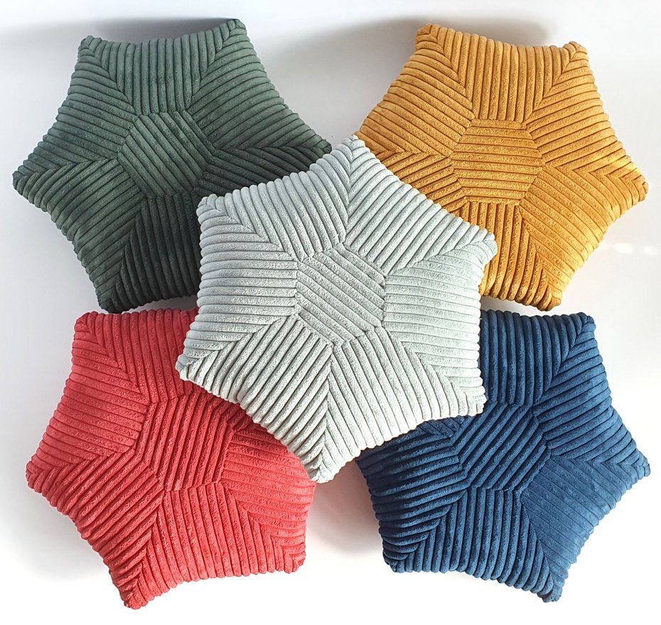 Poduszka w kształcie heksagonu jest równie wygodna jak tradycyjne kwadraty czy prostokąty i dobrze wygląda w ich towarzystwie. Dobrze komponuje się z poduszkami z innych tkanin i wzorów. Jej kształt i faktura przypominają kwiat – taki geometryczny kwiat.